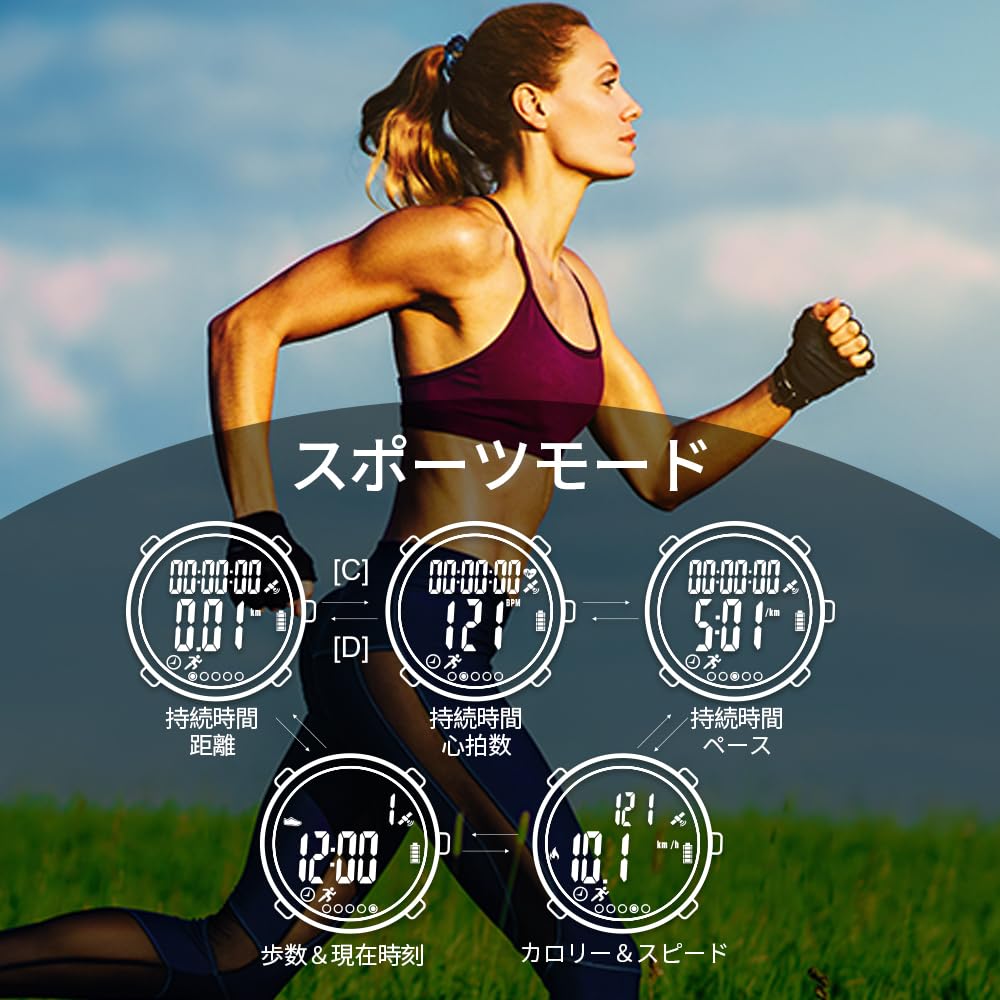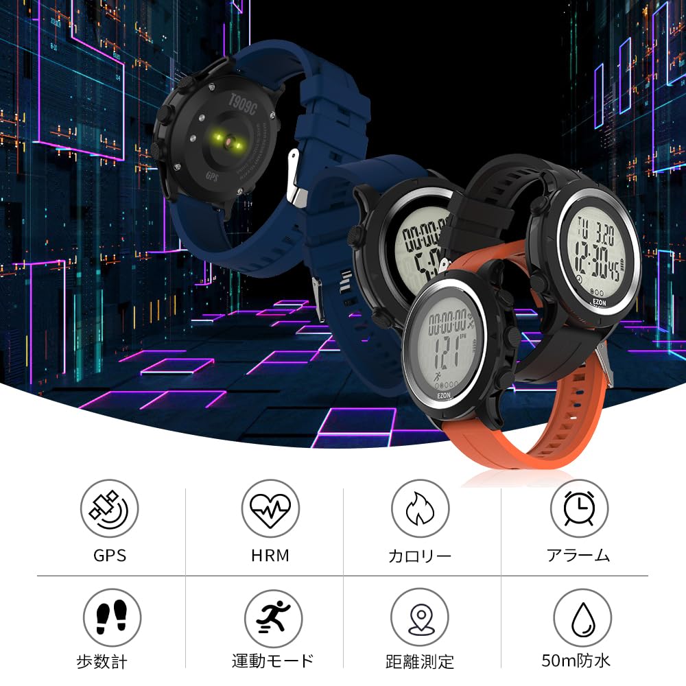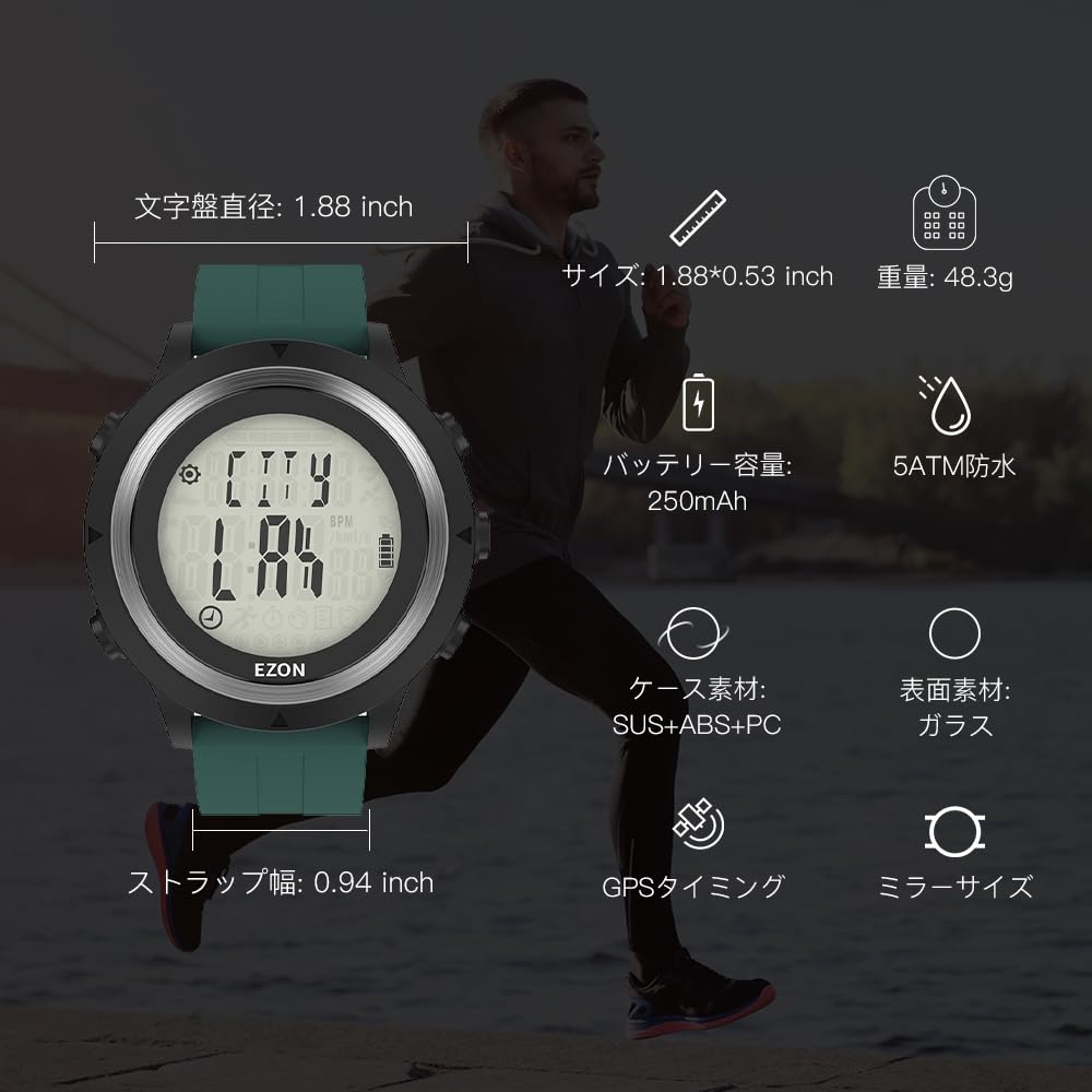 ランニングウォッチ GPS 光式心拍計 腕時計 デジタル ウォッチ 防水 軽量 歩数計 EZONT909 (グリーン)