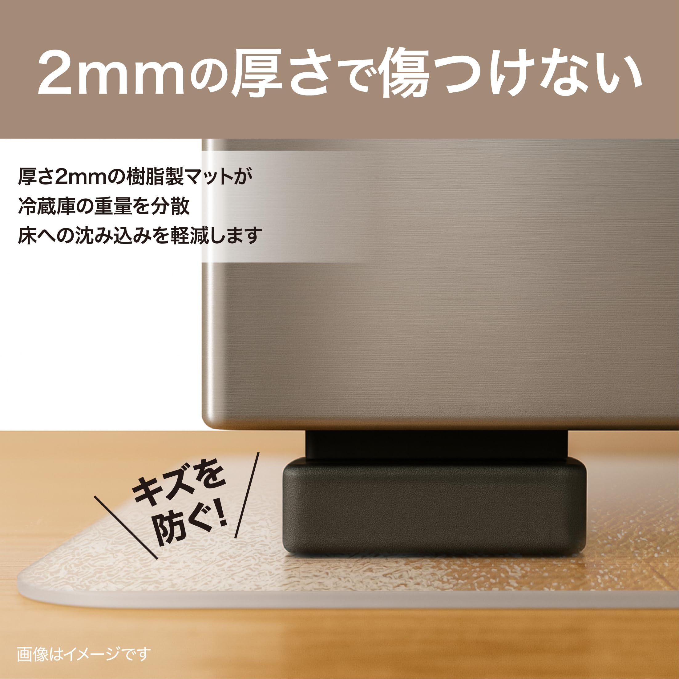 しっかりとした厚さ2mmで、冷蔵庫の重量による床の凹みを軽減。