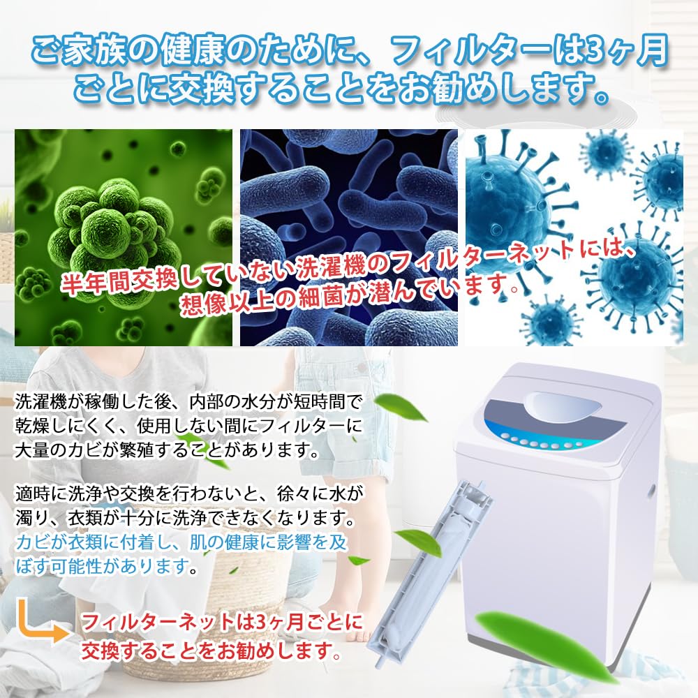 2.【高性能フィルター&お手入れ簡単】目の細かいフィルター網が、洗濯中に発生する髪の毛や糸くず、ゴミをしっかりキャッチし、衣類を清潔に保ちます。また、洗濯機内部の汚れや詰まりを防ぎ、日々の洗濯をより衛生的で快適にサポートします。フィルターは取り外して簡単に洗浄できるため、定期的なメンテナンスも手間なく行えます。カビの発生を防ぐため、3ヶ月ごとの交換をおすすめします。