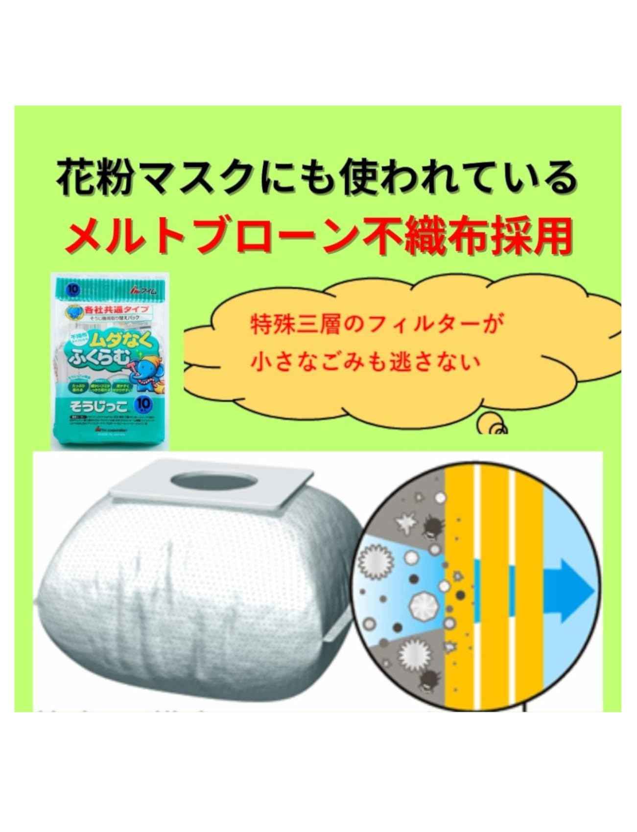 ●メルトプローン製法不織布を使用し、3層構造のフィルターが細かいホコリもキャッチします。