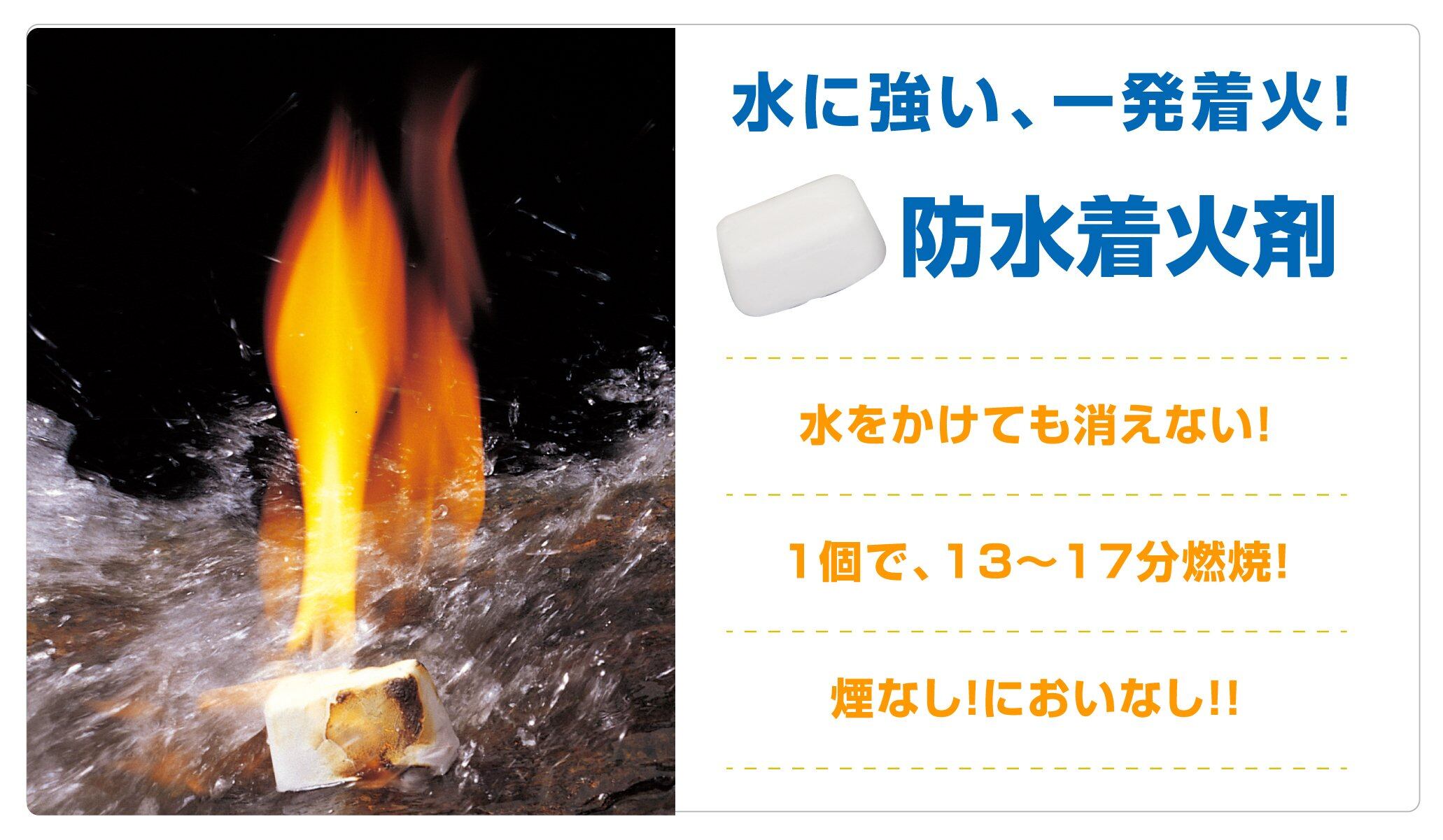 水に濡れても一発着火。一度火がつくと水がかかっても消えません。