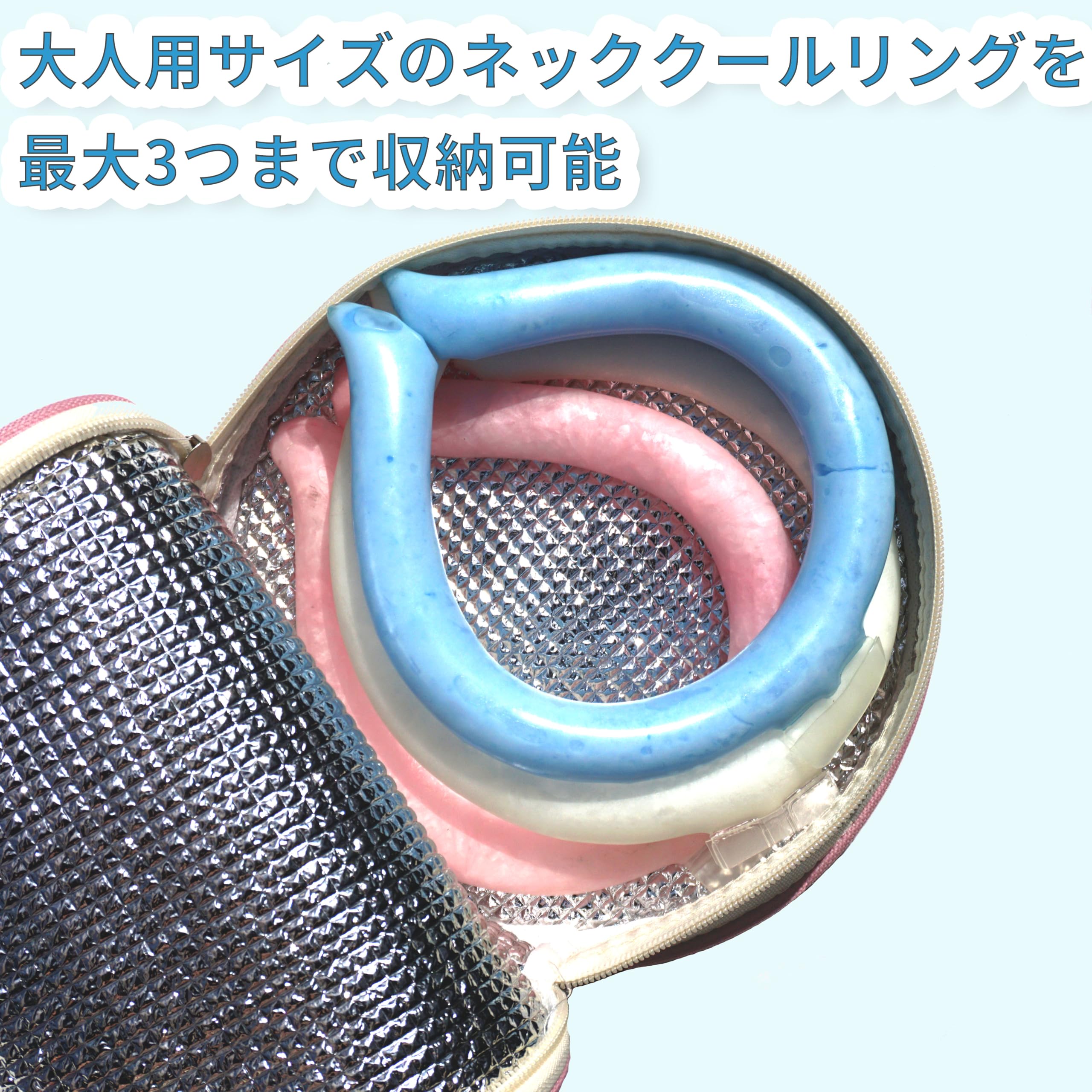 【大容量設計】大人用サイズのネッククールリングを最大3つまで収納可能。広々としたスペースで、涼しさをしっかりキープします。