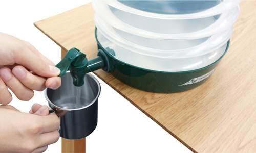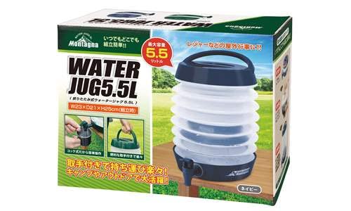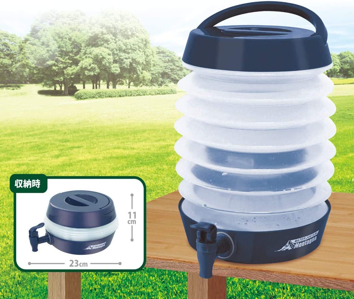折りたたみ式でコンパクトに持ち運びが可能。大容量5.5Lなのでファミリーや複数人でもシェアできます。コック式で簡単に注水/止水の切り替えができます。