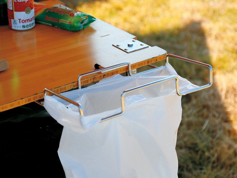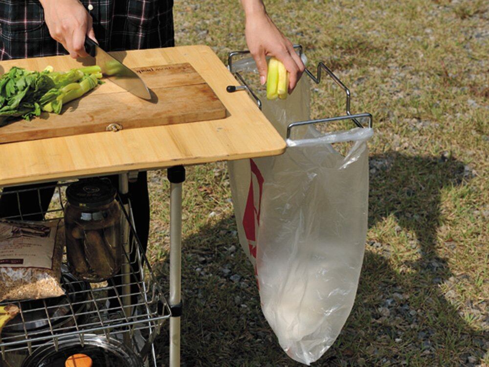 フィールドキッチンテーブル竹(CK012T)の天板にセットして、袋を掛けるとゴミ袋スペースができあがります。