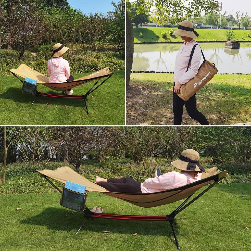 【頑丈なポール】本製品のポールは直径3㎝の太めポールを使用していて、軽いだけではなく、安定及び安全を重視しております。生地は300Dナイロンを使用、通気性よし、洗濯便利、汚れにくい、軽量防水という特徴もございます。脚部分には滑り防止キャンプ付き、地面の状況が悪くても滑らないで普通に使えます。【アップグレード版】ハンモックのベッド布の右側にポケットを追加して、携帯電話などを入れることができます。