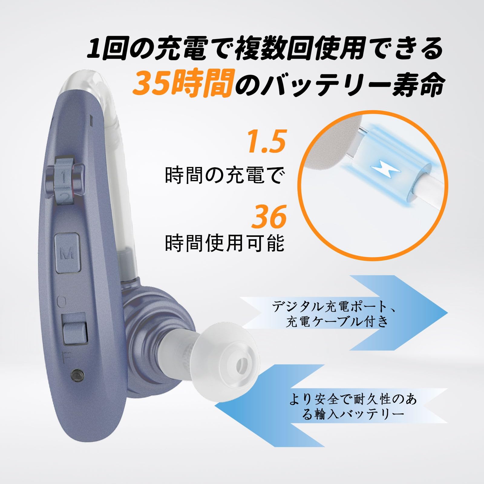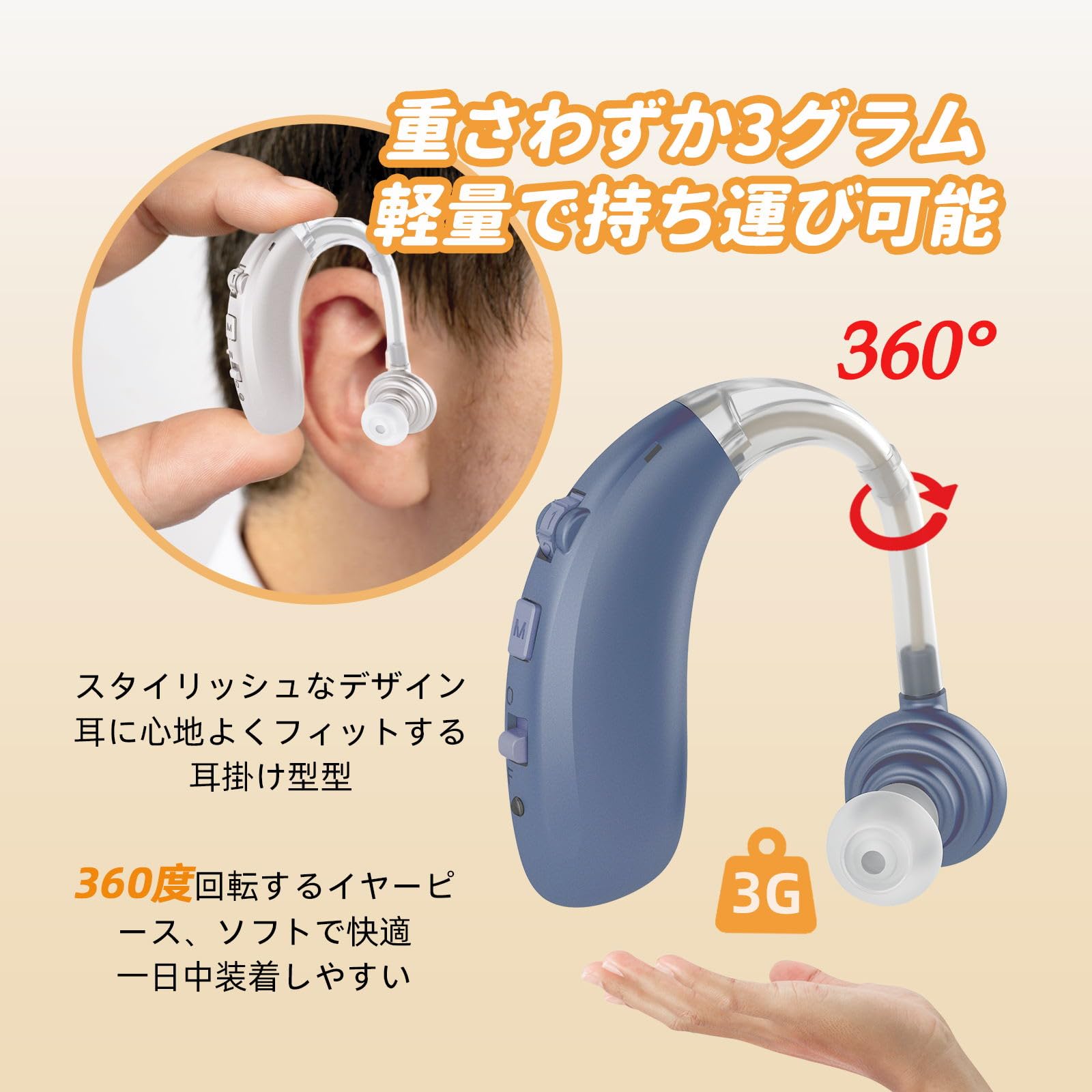 耳掛けタイプ、左右両用耳の後ろにまわして、ひっかけて固定し、落ちる心配はなく、楽々に利用できます。 右耳にも左耳にも使用可能、耳の聞き状況に合わせて自由に使えます。