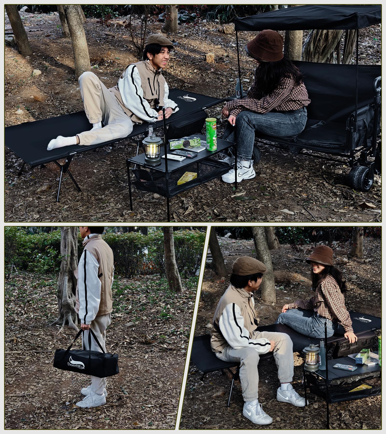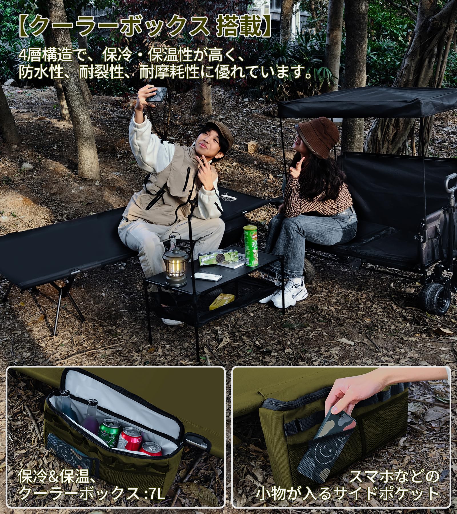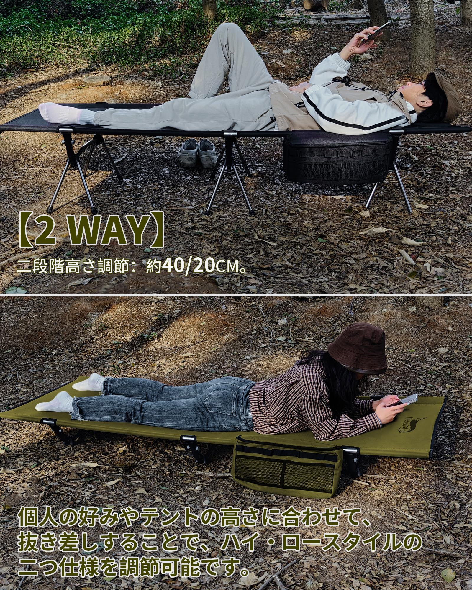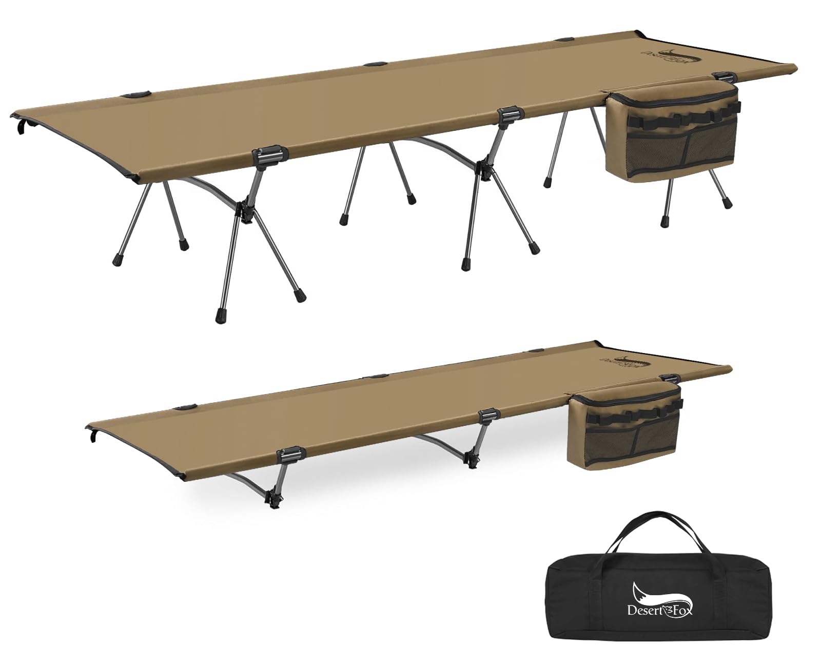 DesertFox コット キャンプ 2way 軽量 150KG高耐荷重 クーラーボックス付き 折りたたみ 小物収納 ハイ/ロー切替可能 アウトドアベッド 寝心地 通気性 撥水素材 超軽量航空機素材 バッグアジャスタブル コット 防災 自宅用 オフィス 収納バッグ付き(カーキ,Large)