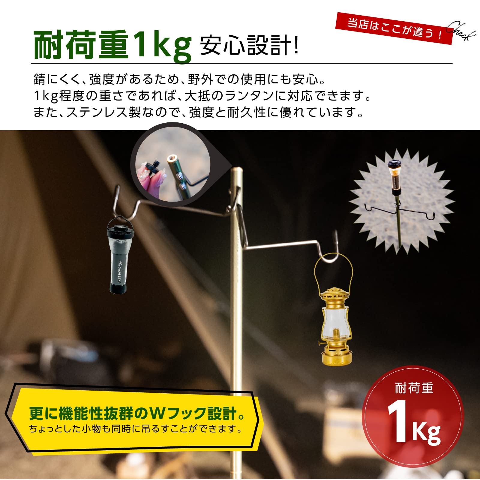 「軽量で超強力!7075アルミニウム採用のアウトドアランタンスタンド」当社のランタンスタンドは、軽量でありながら強度がある7075アルミニウムを使用し、地面に刺すペグ式のパーツにはステンレス素材を採用しています。この素材の組み合わせにより、アウトドアでの使用に最適なアクセサリーとなっています。?また、ペグをしっかり地面に固定し、最大1kgまでの荷重に対応できるため、ランタンや他の装備品を安定して保持するのに十分な強度を備えています。