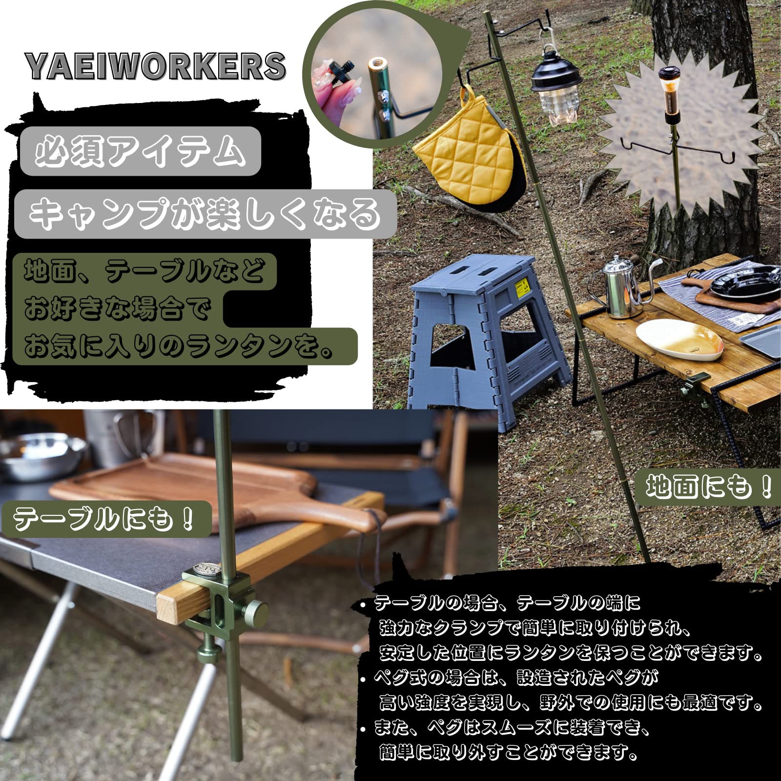 「アウトドアに最適!最新三用ランタンスタンド」は、強力なクランプを使用することで、テーブルの端に簡単に取り付けることができます。?クランプはしっかりと固定され、安定した位置にランタンを保ちます。?また、ペグ式の場合は高い強度の鍛造ペグを使用しており、野外での使用に最適です。装着や取り外しもスムーズで簡単です。クランプ式の場合は様々なテーブルに対応しています。?ペグ式の場合はペグにロープが付属し、深く潜り込んだペグも抜くのも簡単です。?さらに、「ランタンスタンドxプレートセット」を購入すると、プレートをセットしたら物を置くこともできます。簡単に取り外したり収納したりできるため、持ち運びにも便利です。この三用途ランタンスタンドは、アウトドアや旅行に必須のアイテムとなることでしょう。