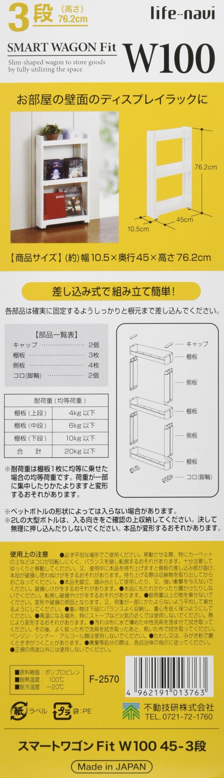 不動技研 スマートワゴン Fit W100 45-3段 約幅10.5×奥行45×高さ76.2cm F-2570