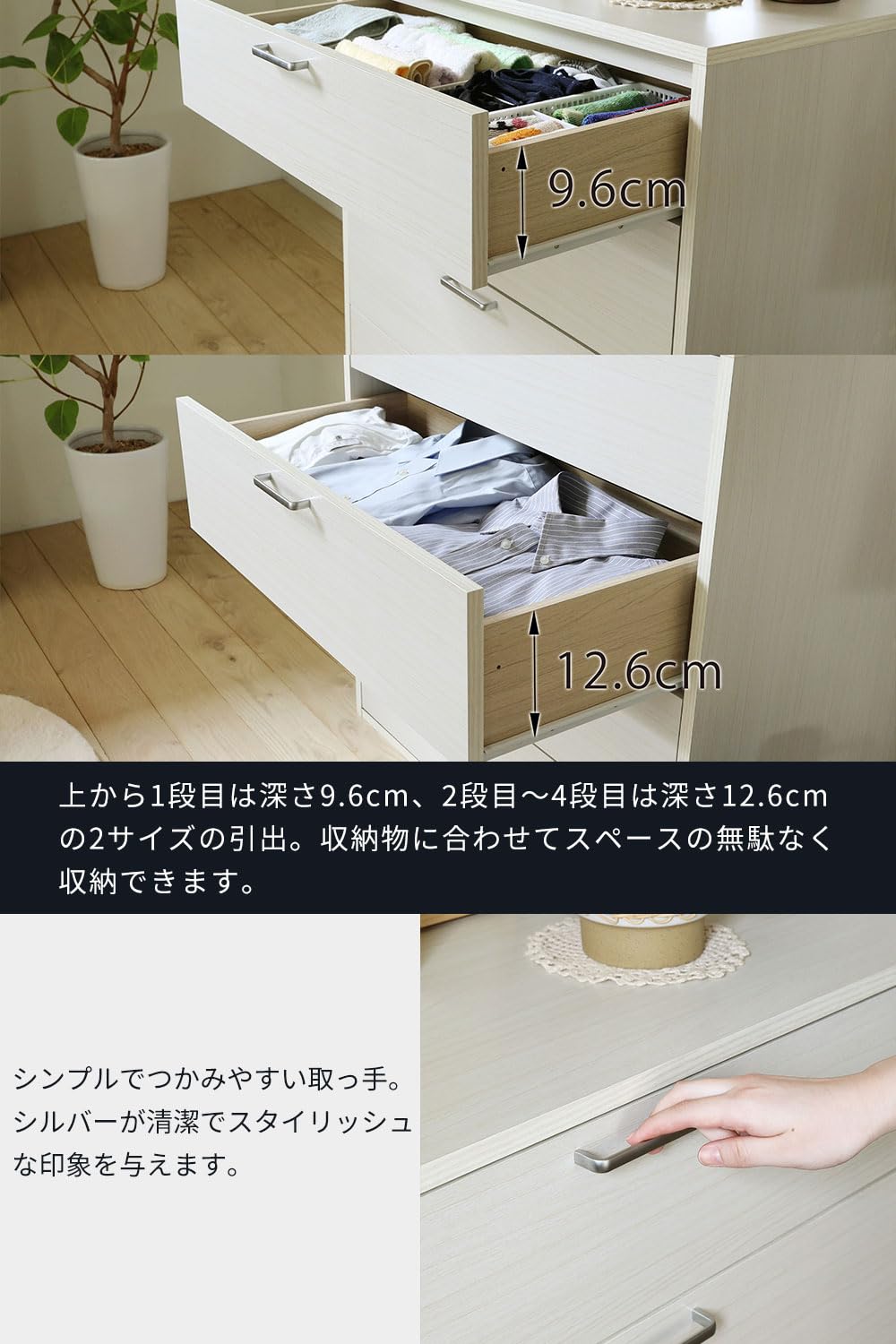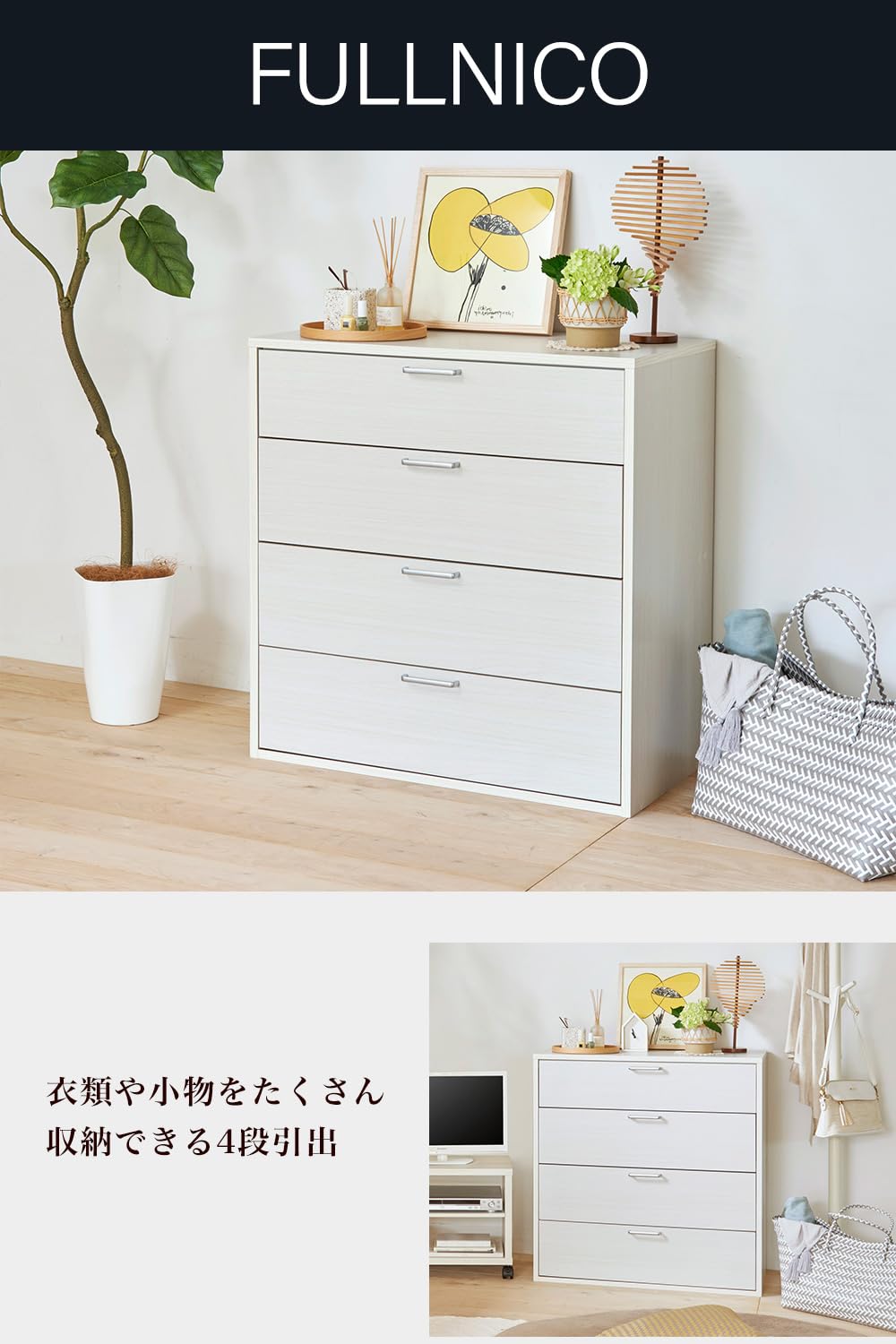 【商品説明】シンプルであきのこないナチュラルな木目柄のフルニコシリーズ。FUL-8080H WHは、4段引出しの洋服収納 整理ダンス。引出にはスチールの頑丈なスライドレールを採用しました。