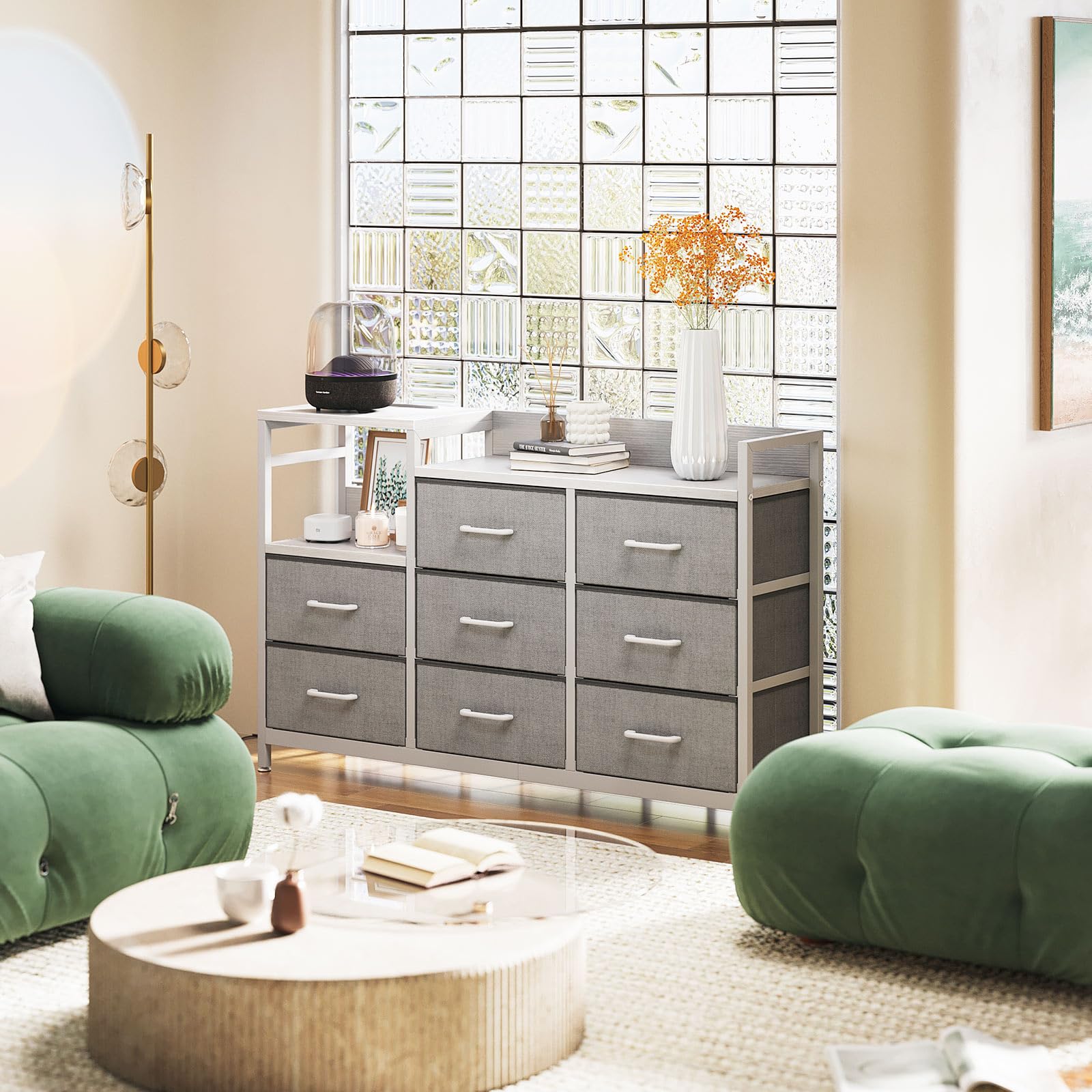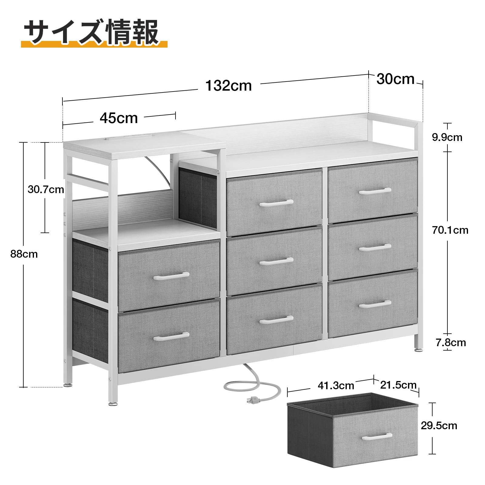 【在庫処分】KKL チェスト タンス 収納ケース 引き出し 衣類収納 リビング収納 布製 引き出し 衣装ケース 箪笥 転倒防止 安定感 3段8杯 (グレー+ホワイト 幅132×奥行30×高さ88cm)