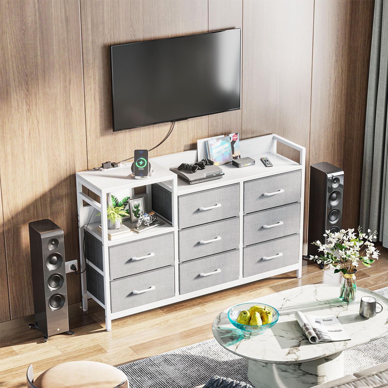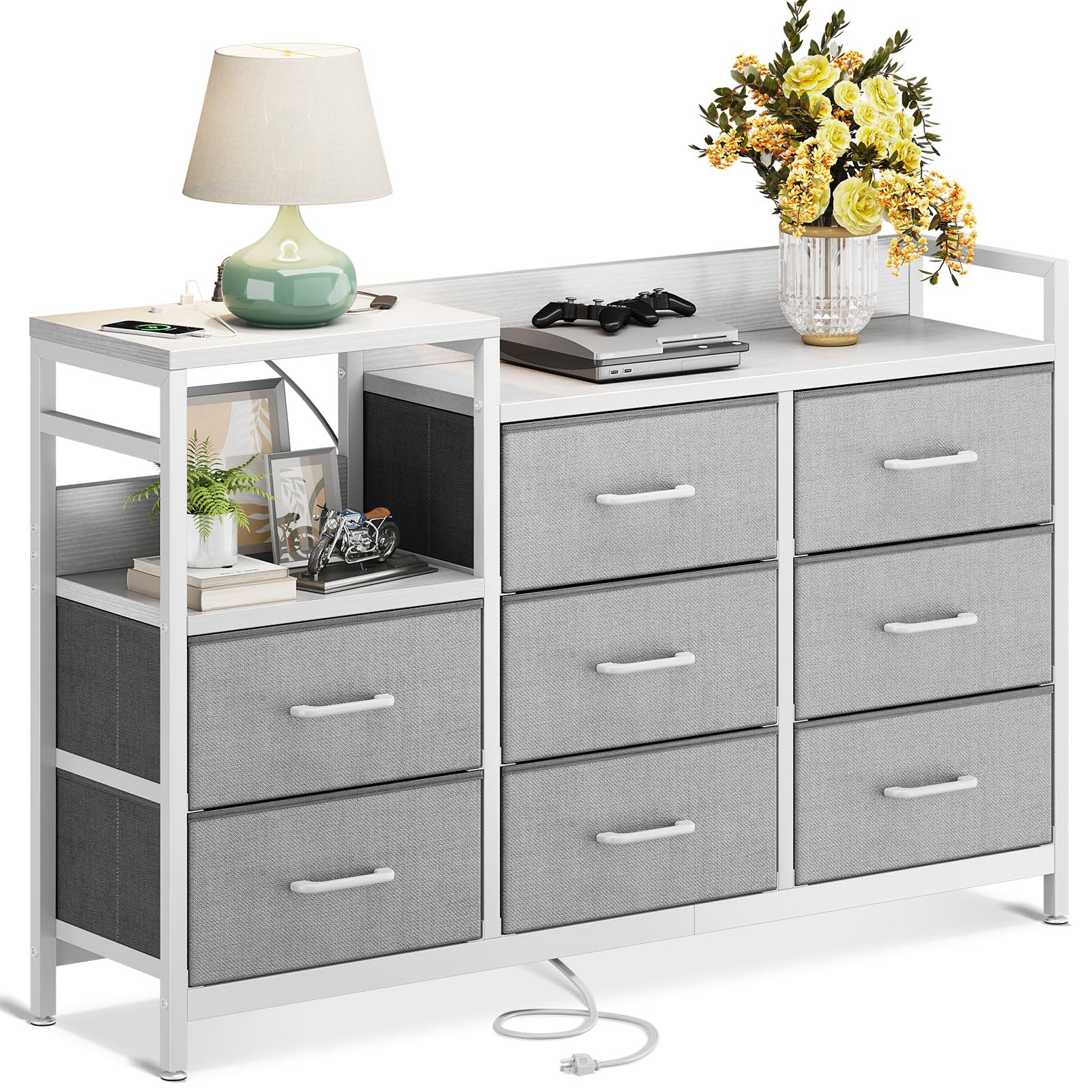 KKL チェスト タンス 収納ケース 引き出し 衣類収納 リビング収納 布製 引き出し 衣装ケース 箪笥 転倒防止 安定感 3段8杯 (グレー+ホワイト, 幅132×奥行30×高さ88cm)