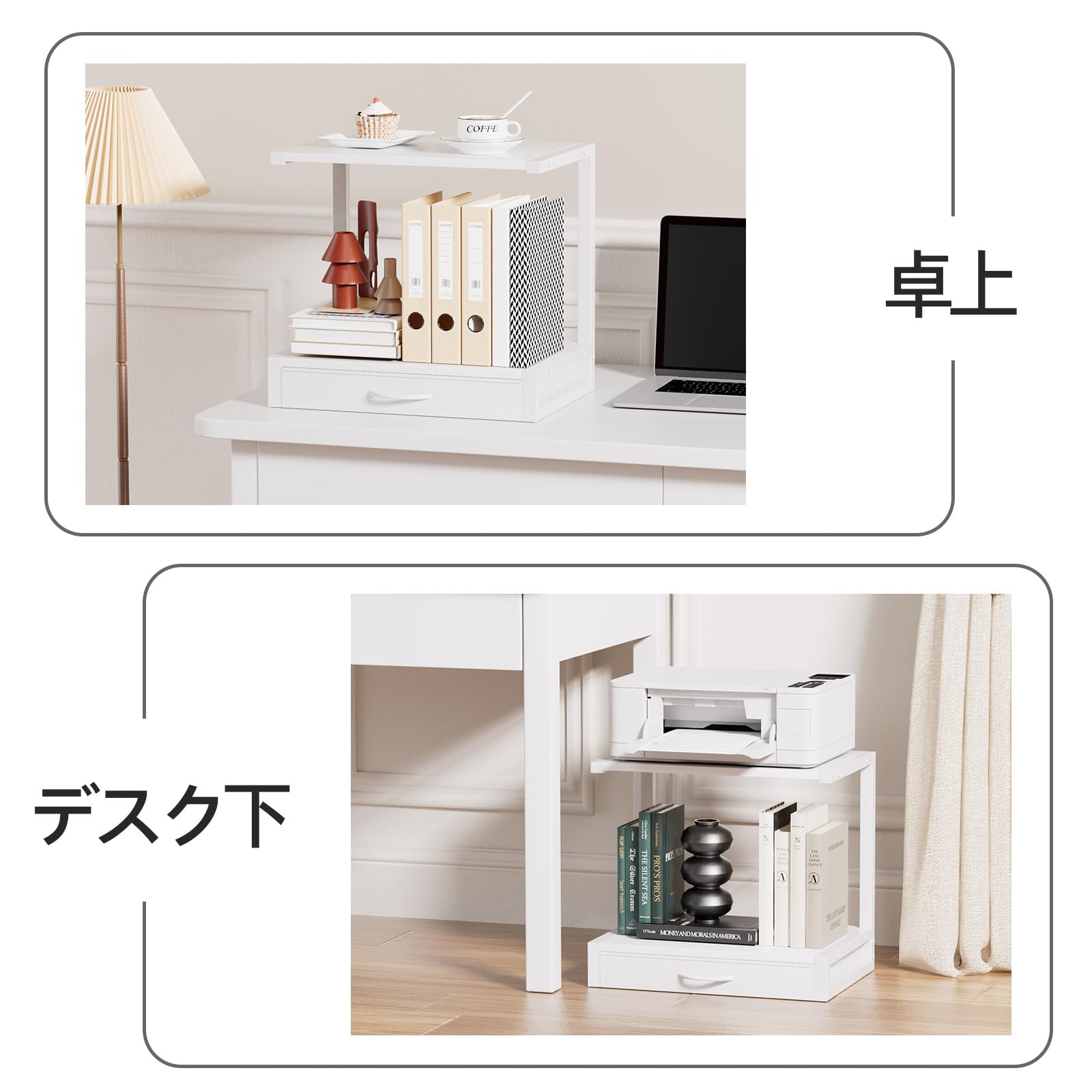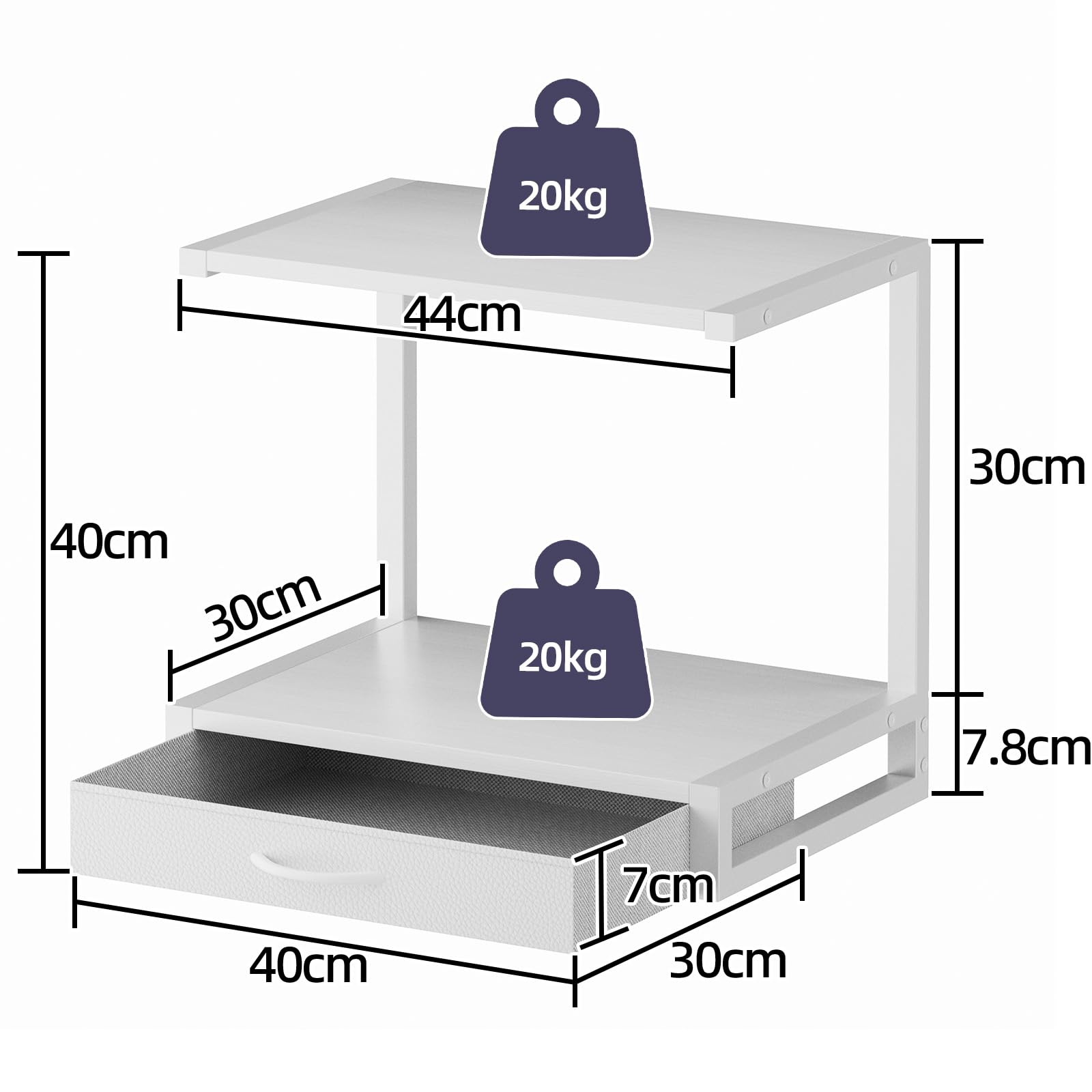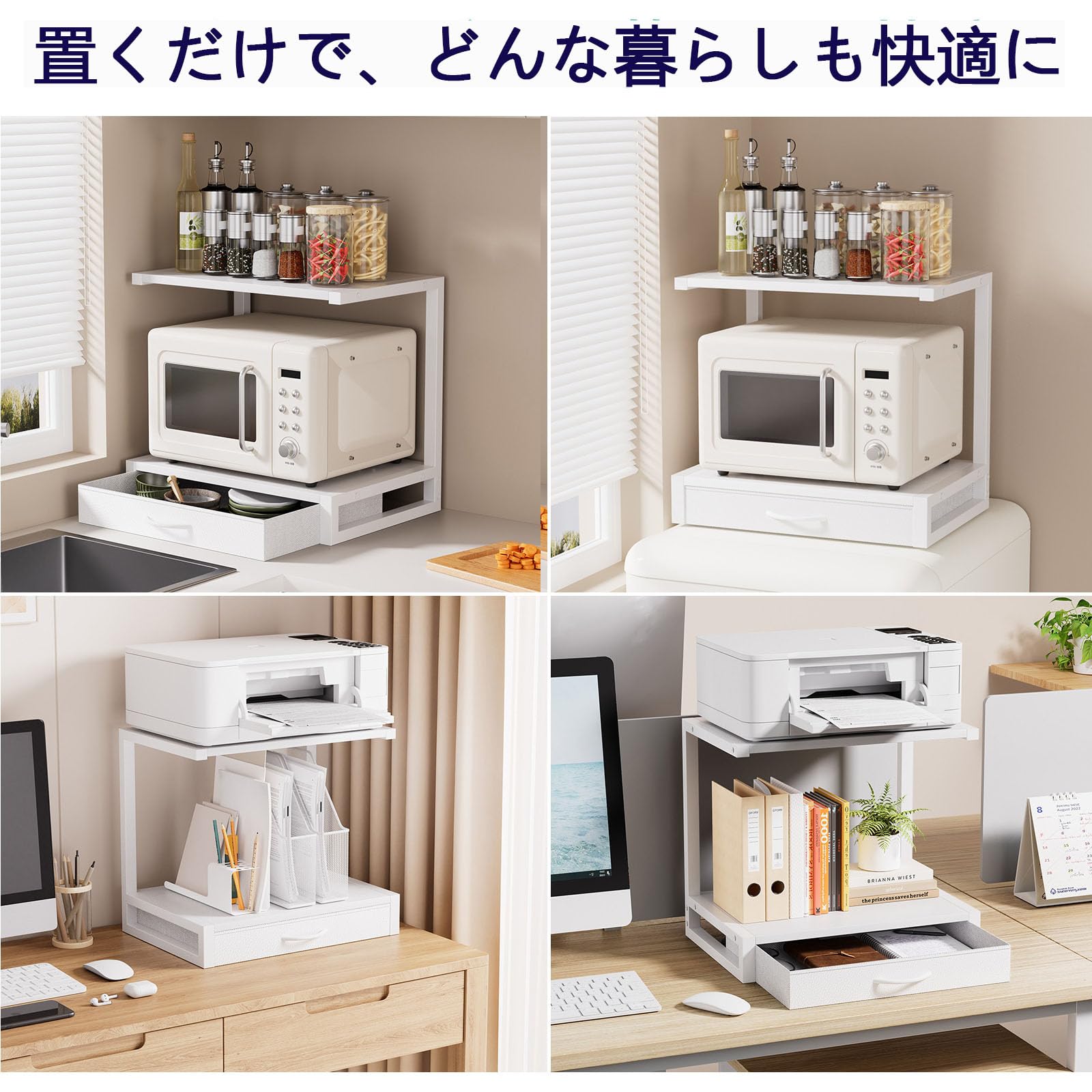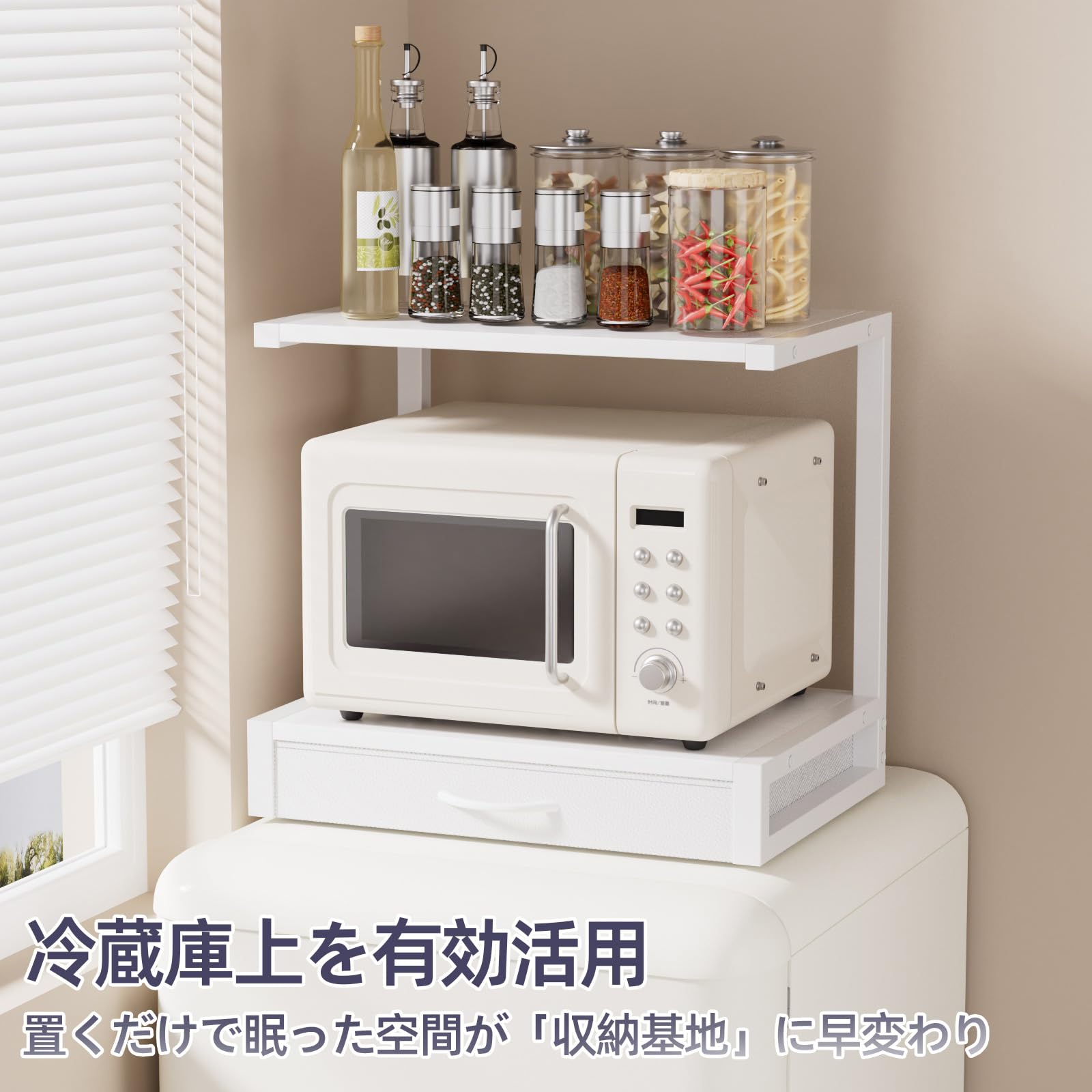 レンジラック 卓上 引き出し付き 電子レンジラック 冷蔵庫上収納 キッチンラック 幅44cm×奥行30cm×高さ40cm 省スペース 耐荷重40kg イロドリモク (ホワイト)