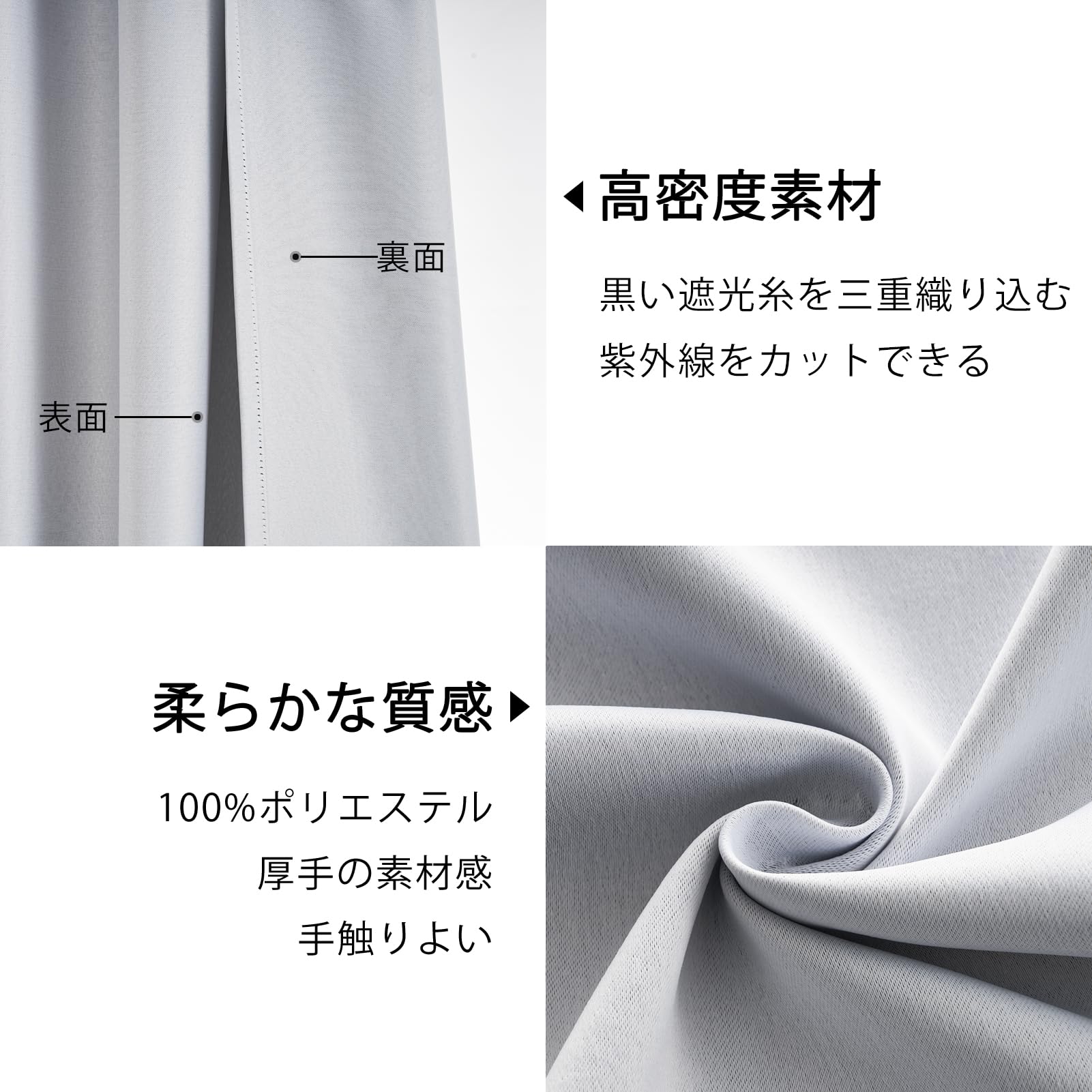 【生地】ポリエステル100%、柔く滑らかな無地カーテンです。色は落ち着いて、高級感がある。生地の表と裏が同色なので、間仕切りカーテンとして使いやすいです。