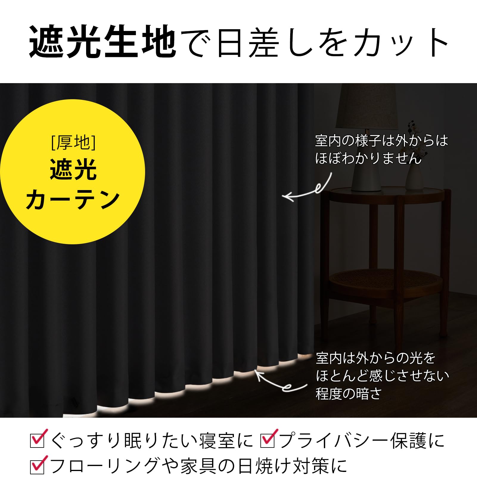 【遮光】三重織りのテクノロジーを利用して黒い系を織り込んだ生地は、優れた遮光機能を備えている。室外からの日差しや紫外線などをしっかり遮る厚地遮光カーテンです。