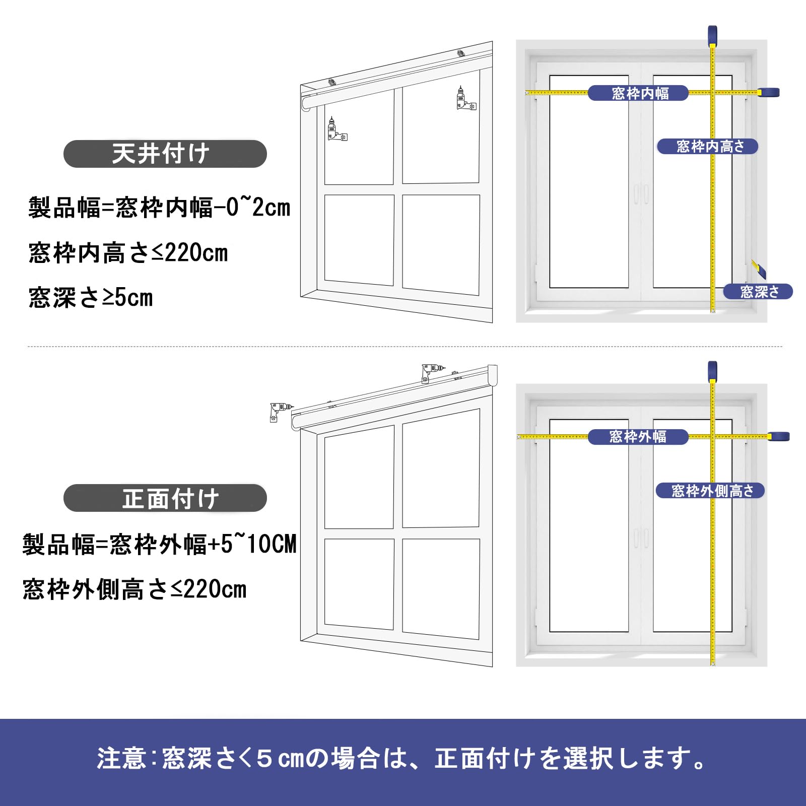 [取り付けと測定]当社のロールスクリーンは天井付けと正面付けの両方に適しています。天井付けをお選びの場合は、ご註文幅よりも内窓幅が0-2cm広いはずです。正面付けをお選びの場合は、外窓より5~10幅広いサイズをお買い求めください。注:天井付けの場合、ウィンドウの深さ<5cmの場合は正面付けを選択してください。(必ず窓の寸法を正確に測定し、購入前に写真の測定説明をよく確認してください。)