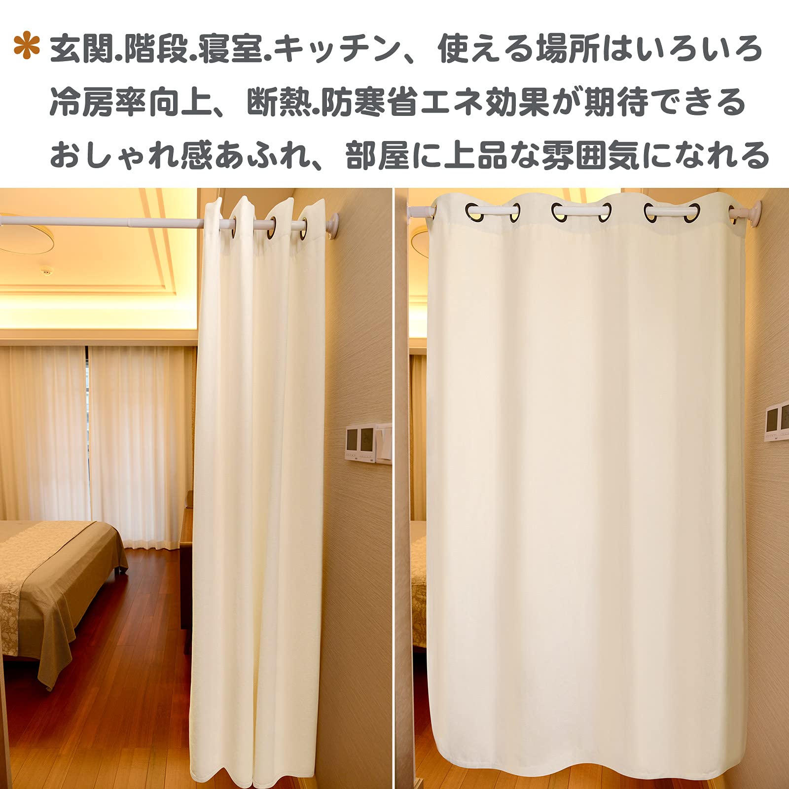 【サイズ】幅120CMx丈230CM一枚入り、重さ850gくらい、「幅60ー90cm範囲の設置場所に雰囲気がいい、最大適用幅は100cmまで」ハトメ8個つき内径4CM、つっぱり棒に簡単に取り付ける間仕切りカーテン(ご注意:つっぱり棒は付属しておりません)