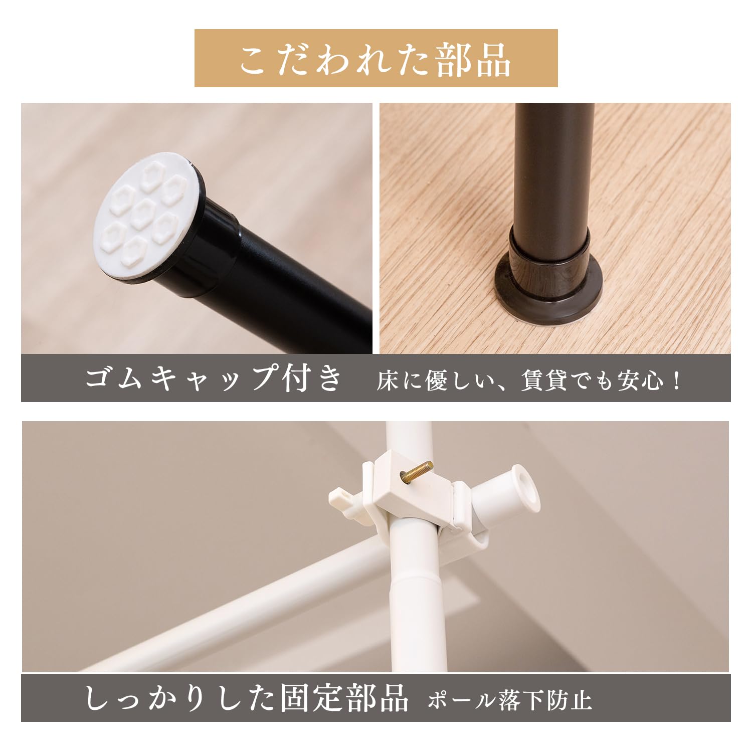 【こだわれた部品】床に優しい、賃貸でも安心できるゴムキャップがつけられます。しっかりした固定部品もポール落下が防止しています。