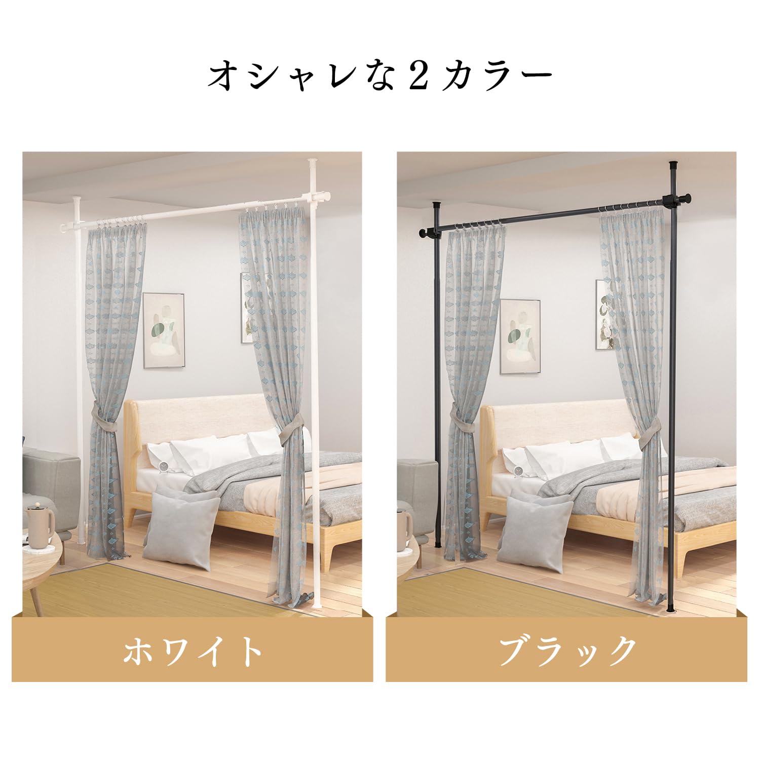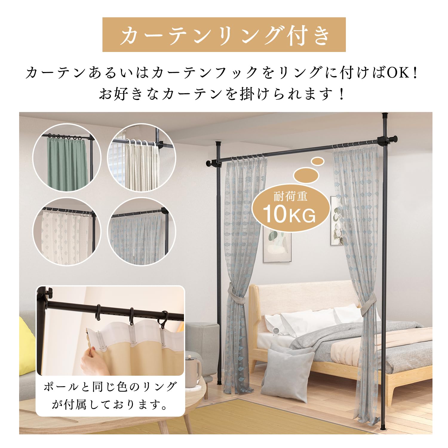 【カーテンリング付き】カーテンあるいはカーテンフックをリングに付けばOK!お好きなカーテンを掛けられます!(耐荷重10KG)ポールと同じ色のリングが付属しております。