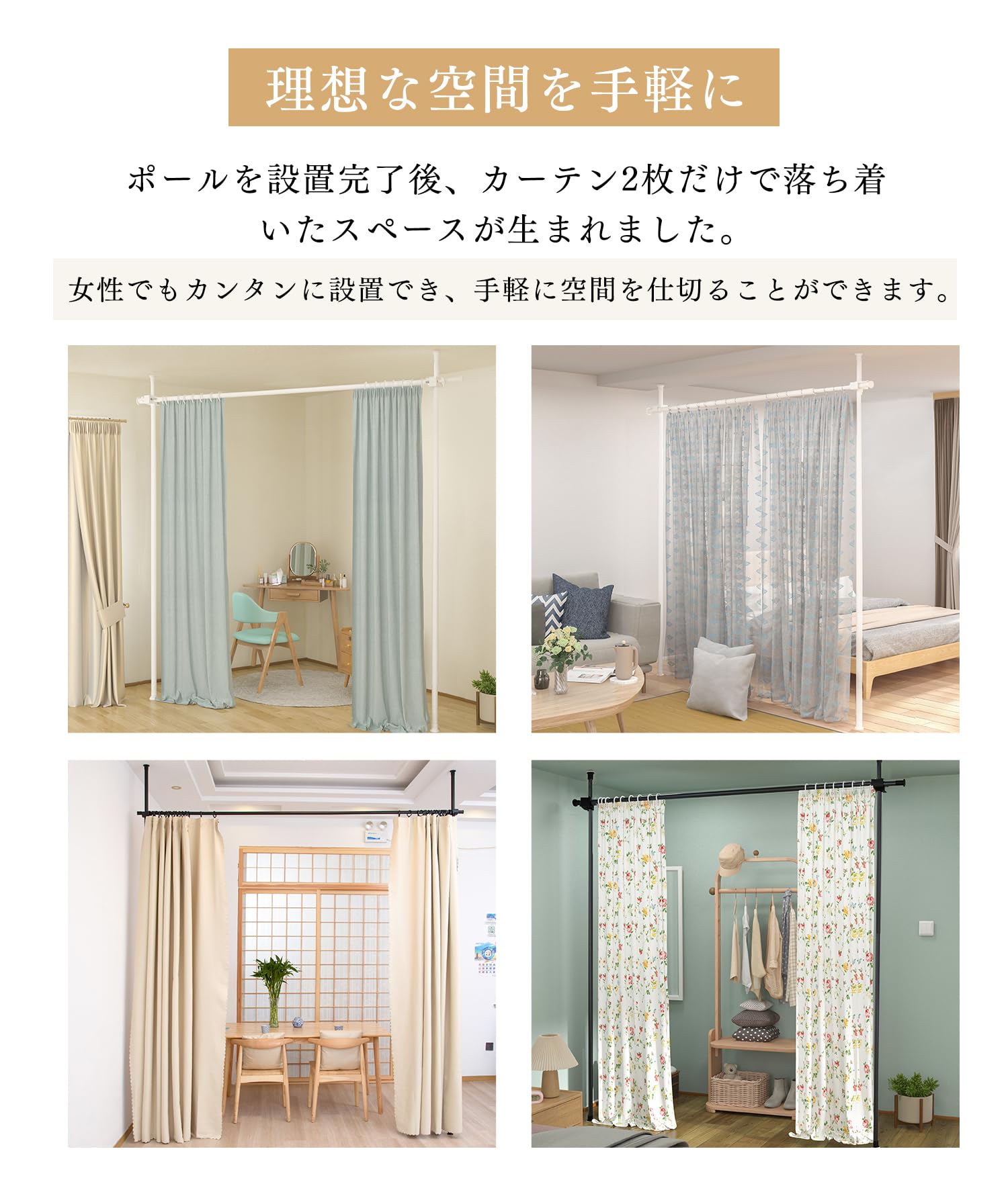 【理想な空間を手軽に】ポールを設置完了後、カーテン2枚だけで落ち着いたスペースが生まれました。女性でもカンタンに設置でき、手軽に空間を仕切ることができます。