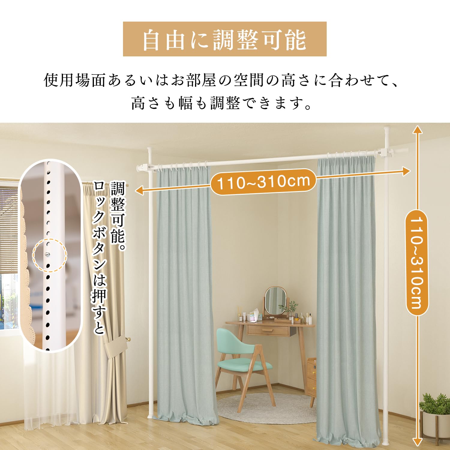 【自由に調整可能】使用場面あるいはお部屋の空間の高さに合わせて、ロックボタンは押すと高さも幅も調整できます。