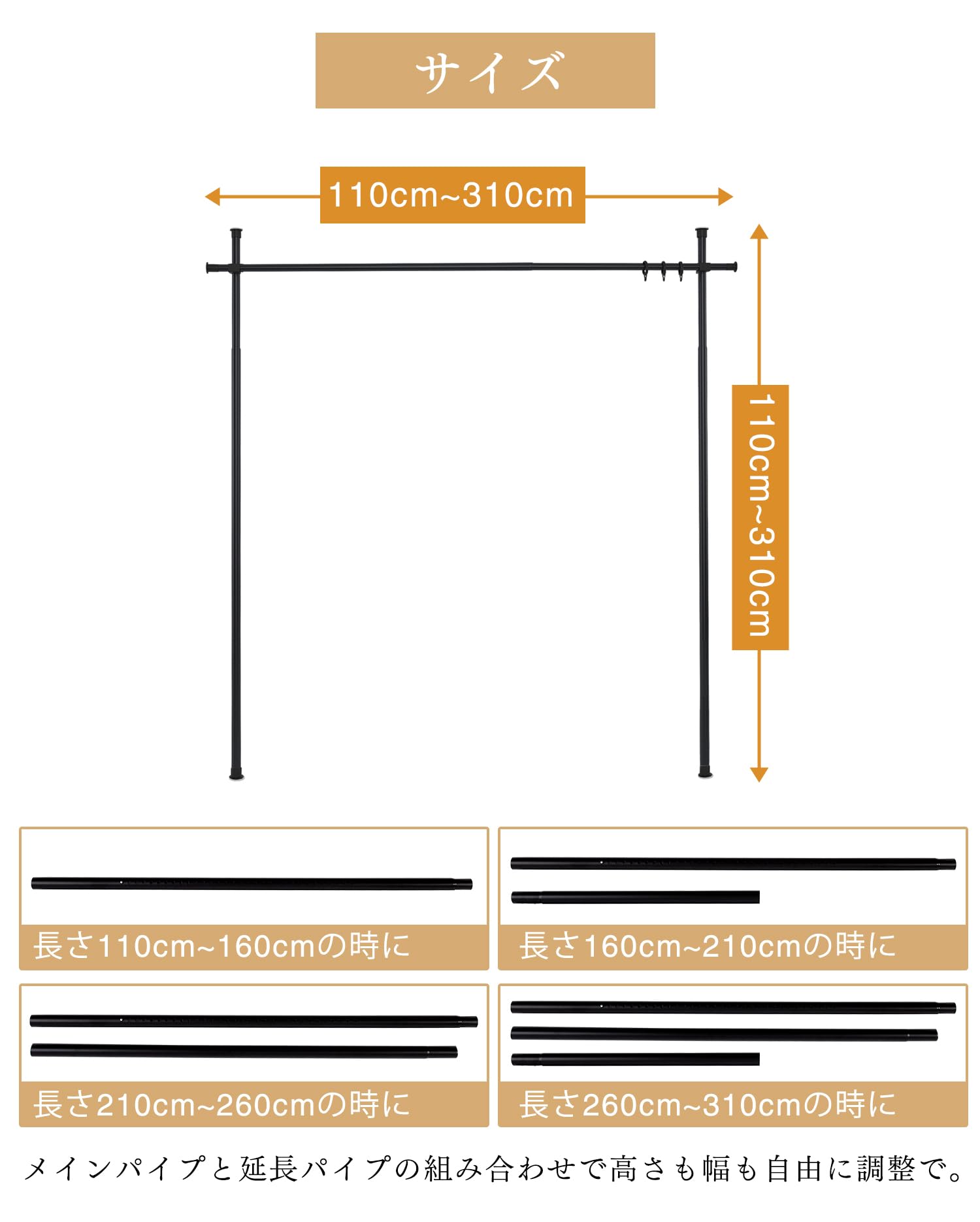 【特価在庫】Qucover カーテンポール カーテンレール つっぱり式 間仕切り 部屋仕切り かんたん突っ張り カーテンリング付 幅-高さ-奥行:110cm-310cm パーテーション 組立品 (2ポール-ブラック) | GIGATERA
