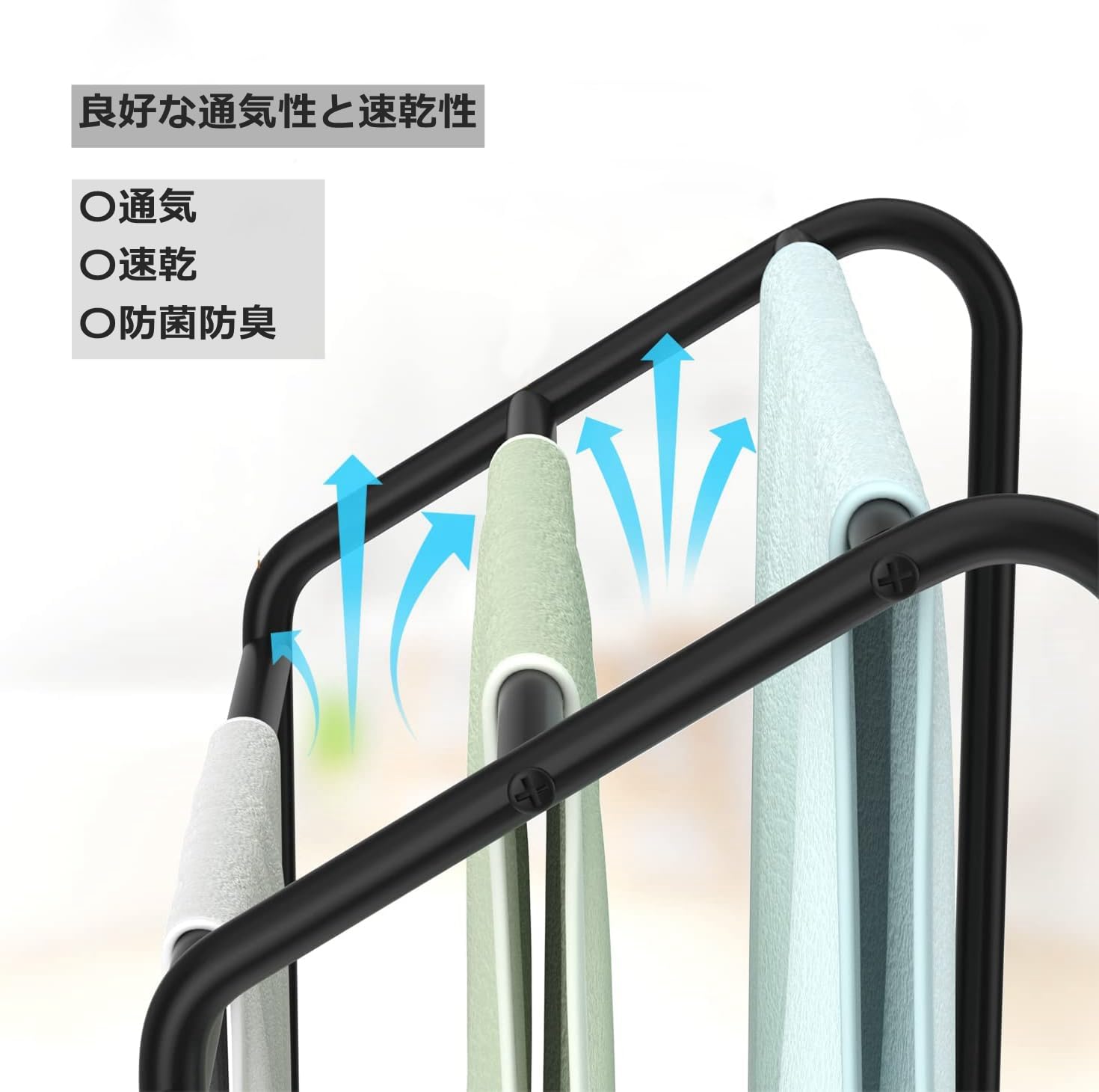 【通気性】 3段の間に適当な距離があり、また異なる高さが設計されており、より通気性があって乾きやすくなっています。