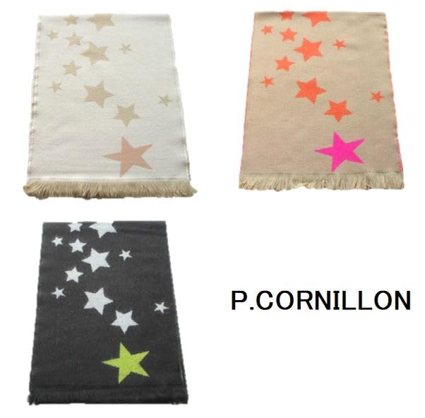 P.CORNILLON ピーコルニオンのマフラー。ウール混のアクリル素材で総柄のジャガード織のスター・星柄のマフラー。コルニヨンのマフラー・ストールは上質なアクリルを使用しているので、肌触りはなめらかで、しかもあたたかいです。