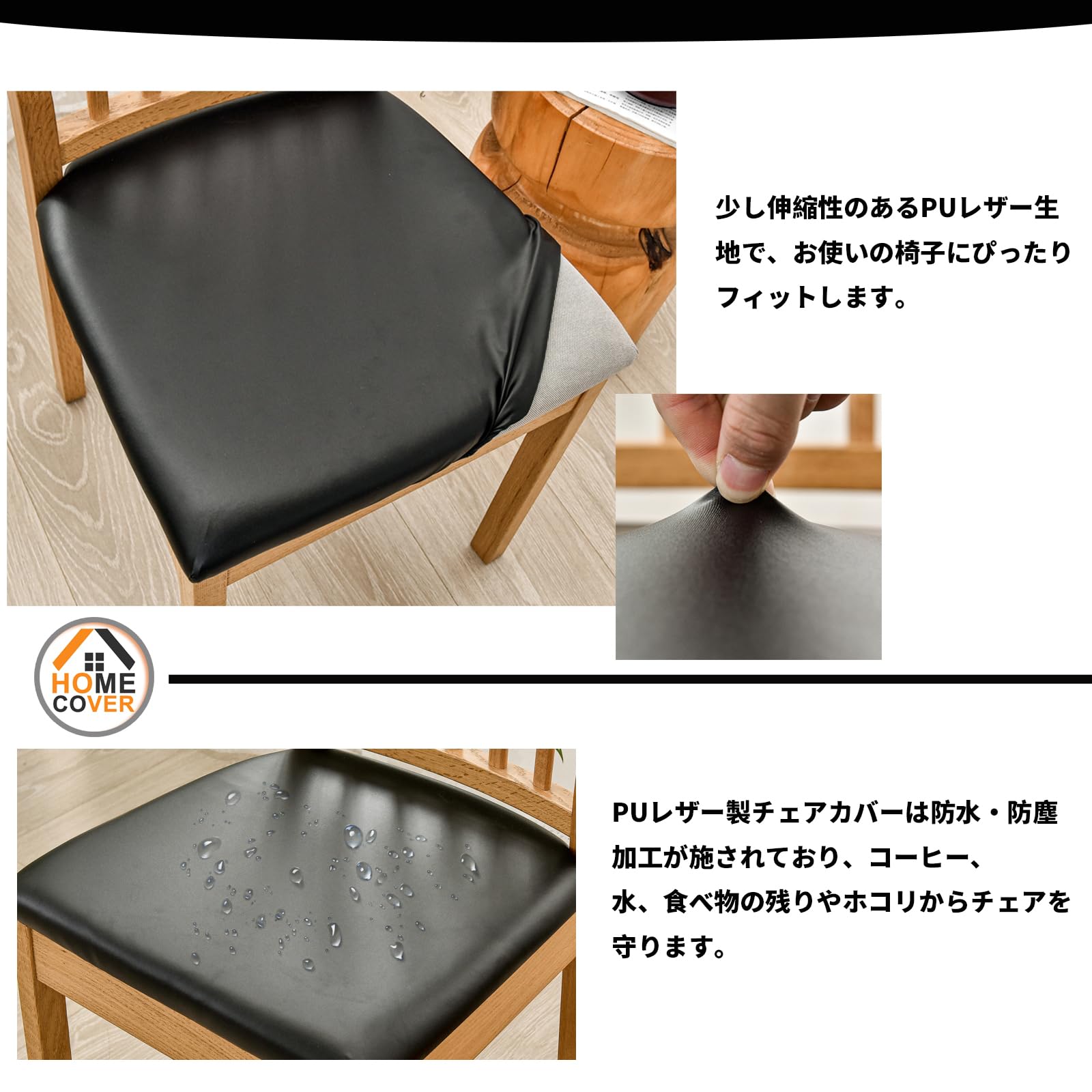 PU 座面カバー, 座面カバー 4枚 椅子カバー 座面 防水 耐久性 取り外し可能 ストレッチ 座面カバー ダイニングチェア用-4枚-黒
