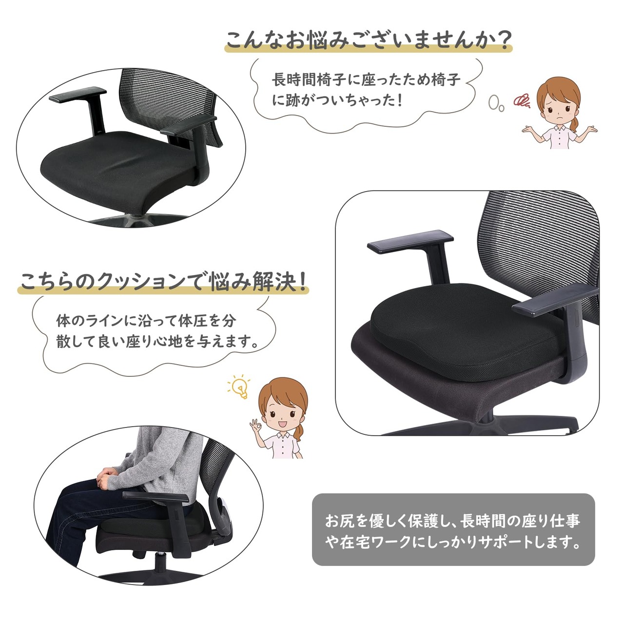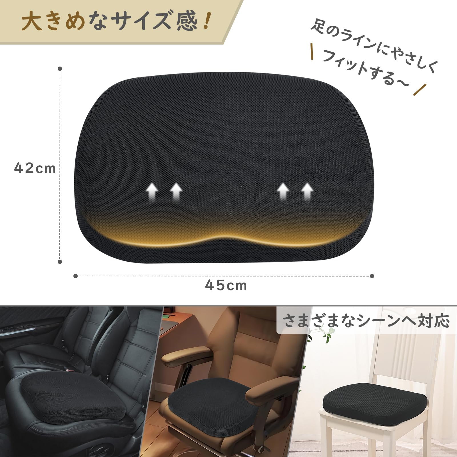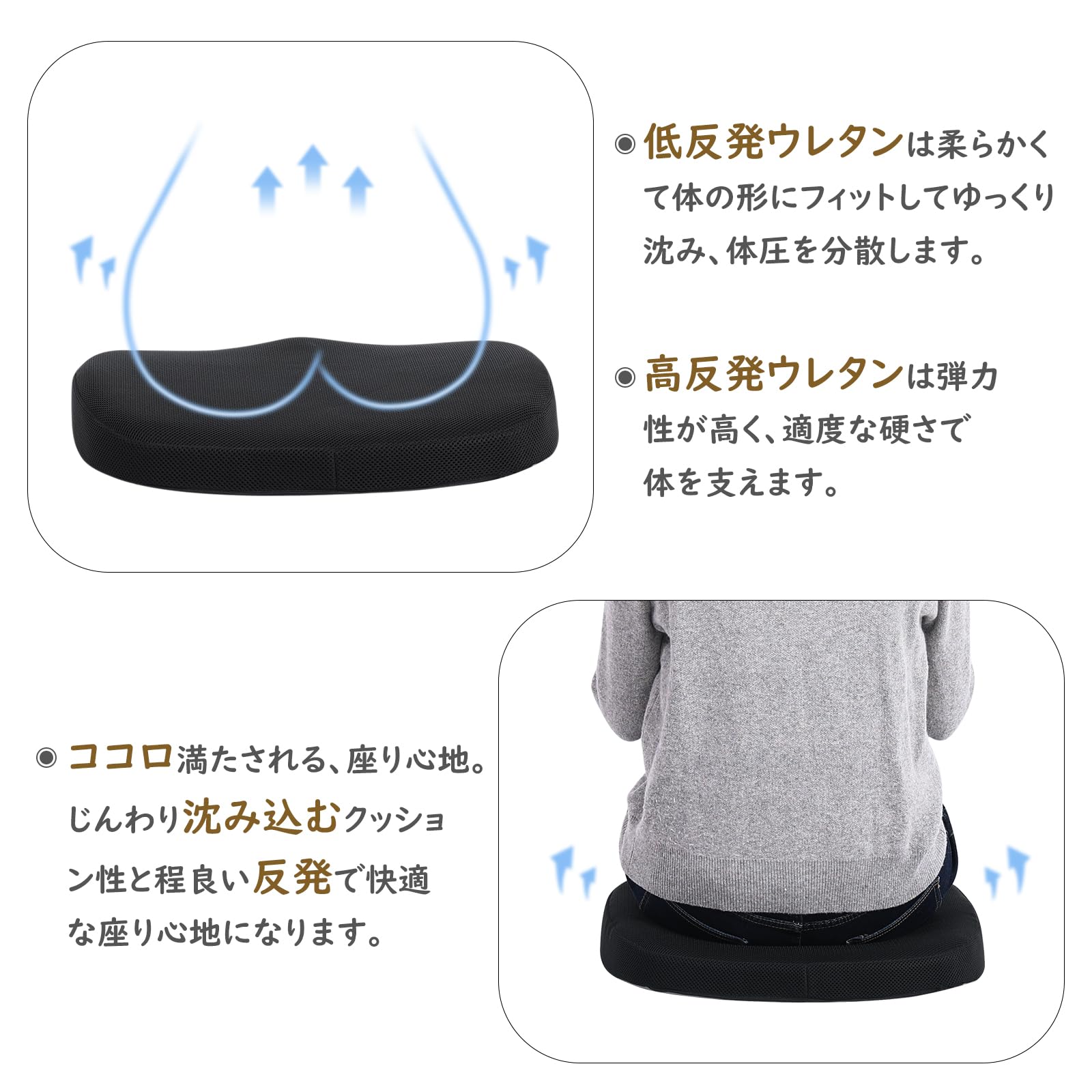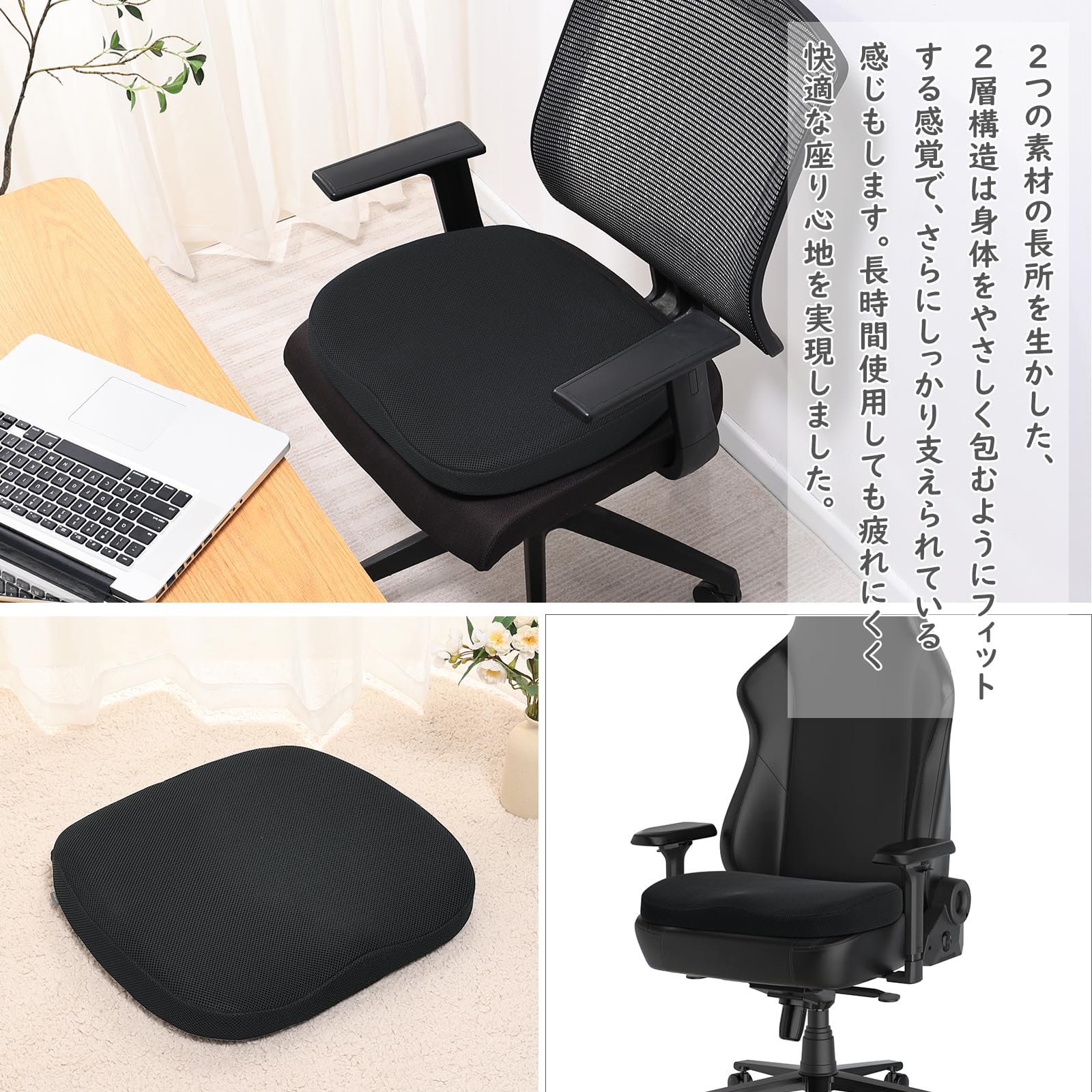 座布団 クッション 大きめ 椅子 クッション 低反発+高反発 座布団 メッシュ 通気 45×42cm 2層構造 ブラック ゲーミングチェア オフィスチェア 車 シート クッション カバー洗える