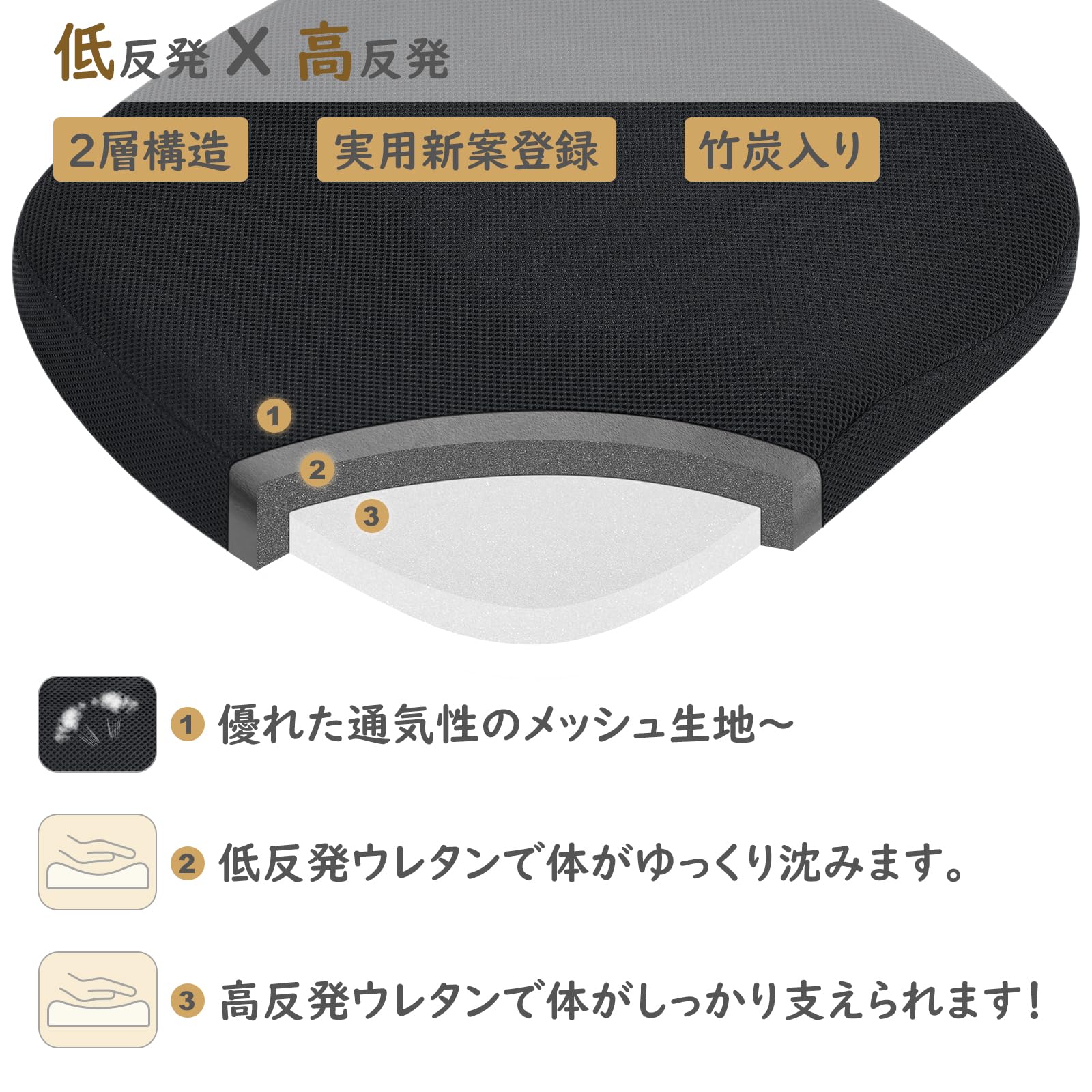 【2層構造】低反発ウレタン+高反発ウレタンでゆっくり沈みつつ、やさしく包むようにフィットし、さらにしっかり支えられます。さらに人間工学デザインで足のラインに沿って、自然とリラックスでき、良い座り心地をあたえます。