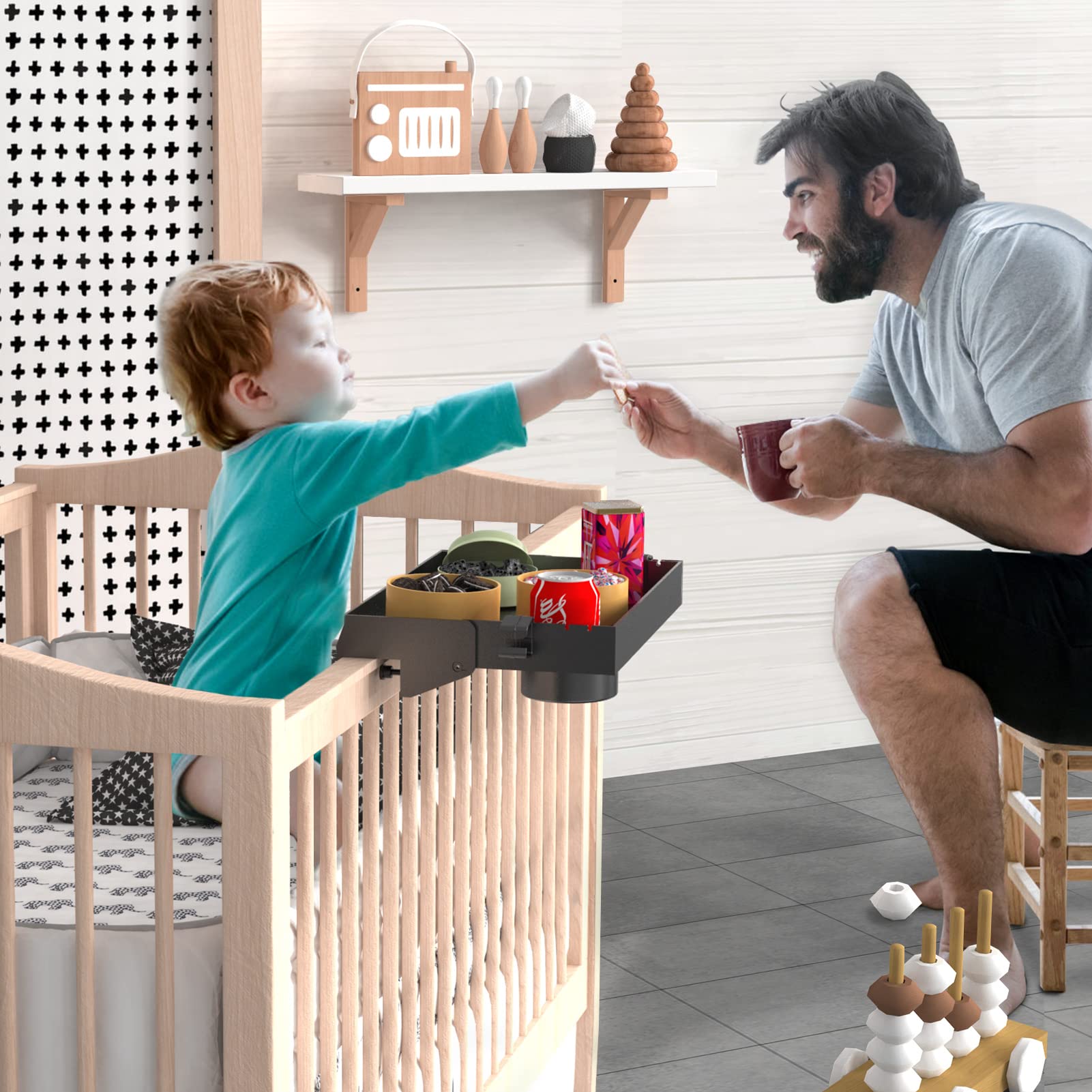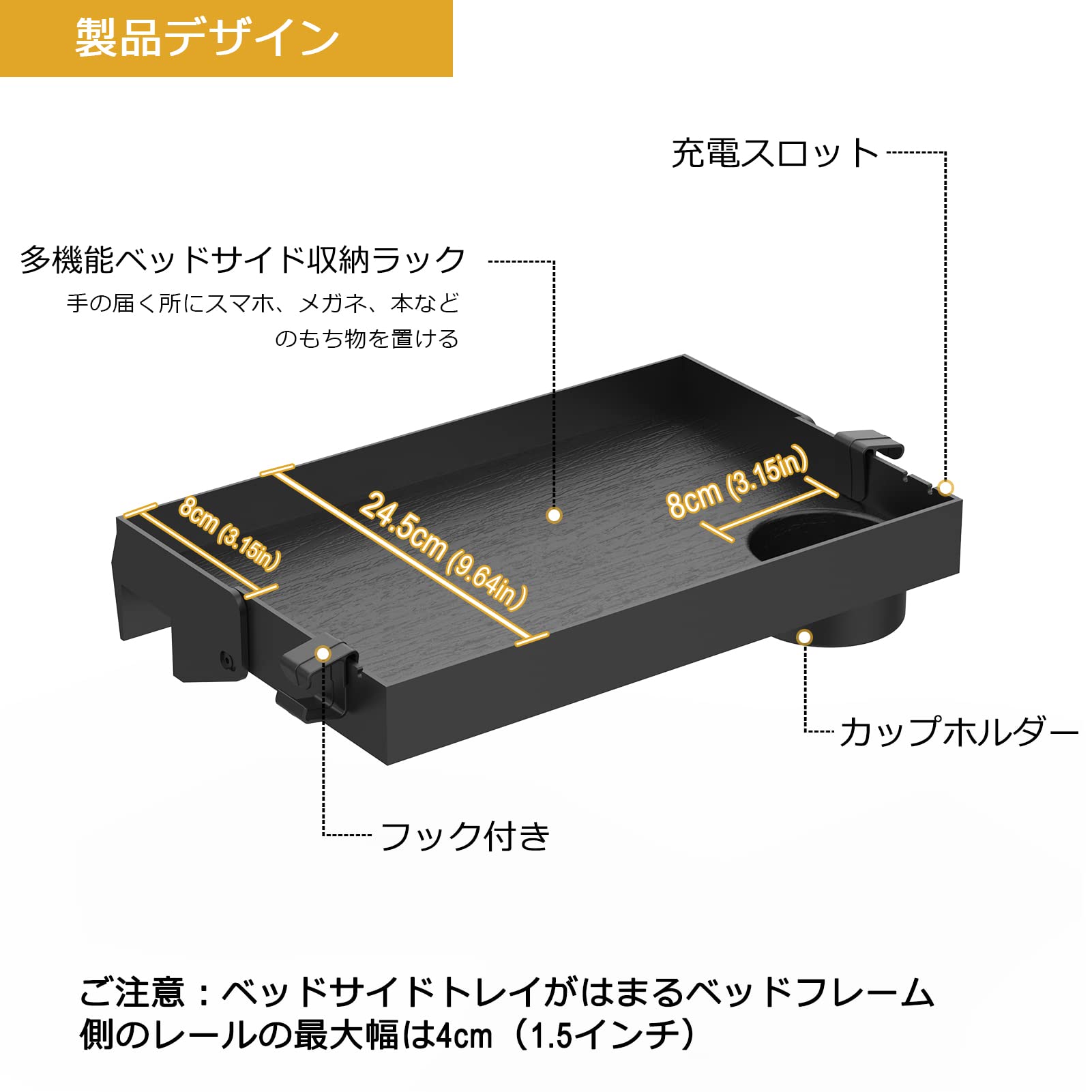 【調整可能】 サイズ:約38.99*24.5*8.5cm。クランプは調整可能で、ベッドサイドトレイがはまるベッドフレーム側のレールの最大幅は4cm(1.5インチ)で、ほとんどのベッドに適しています。