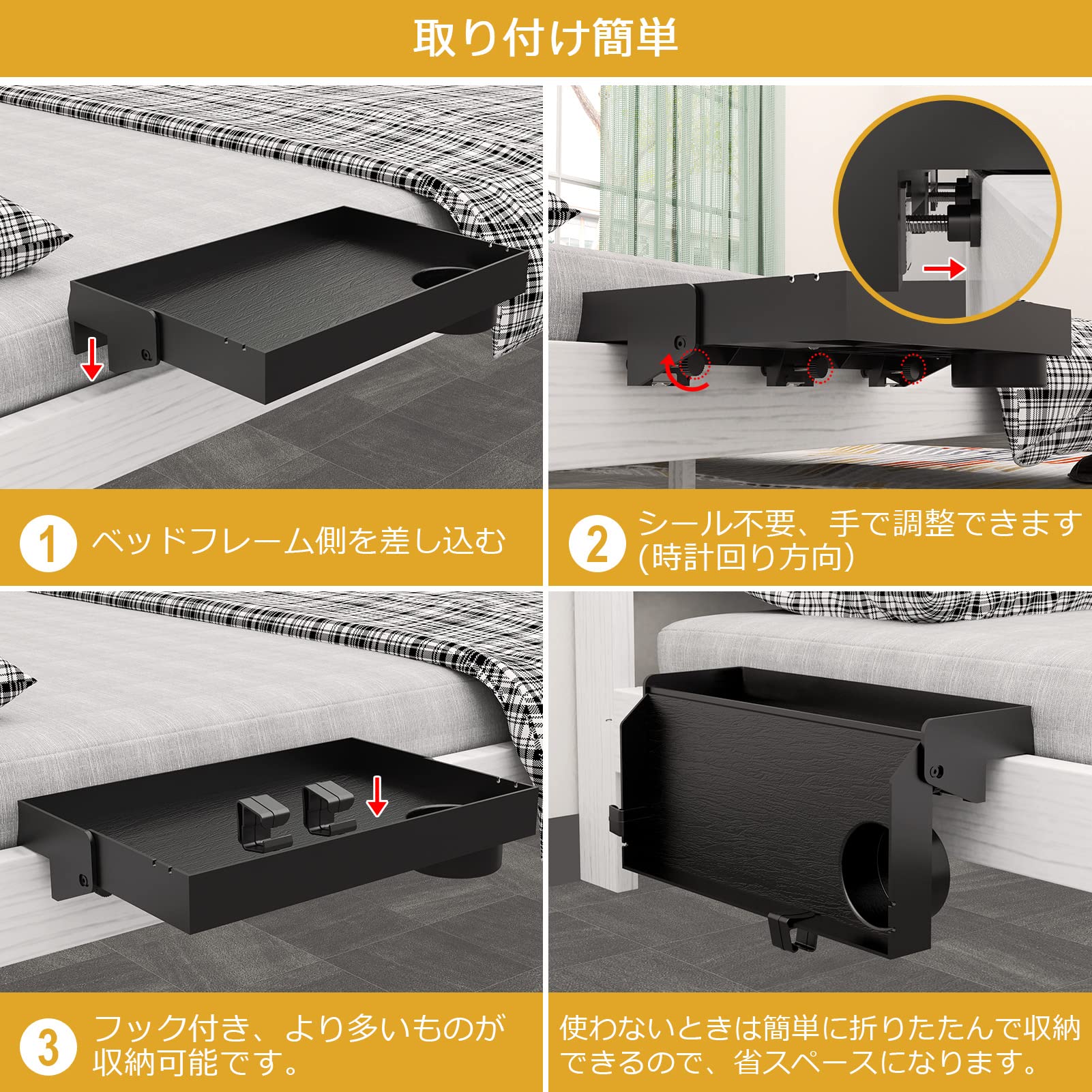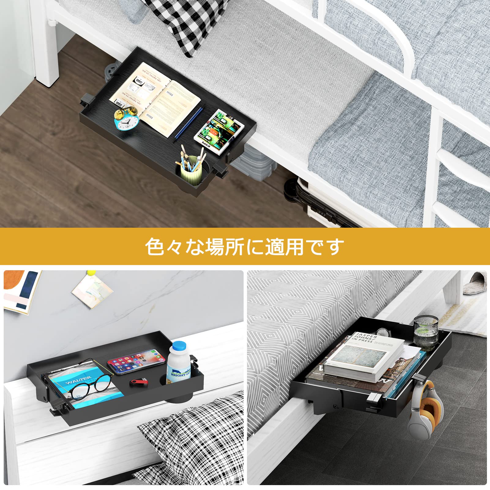 【折りたたみ ・スペース活用】場所を取らない。ベッドサイドクランプ・サイドシェルフは、床のスペースを節約するのに役立ちます。使わないときは簡単に折りたたんで収納できるので、省スペースになります。二段ベッドで寝ている子供たちに最適で、大学では必須です。