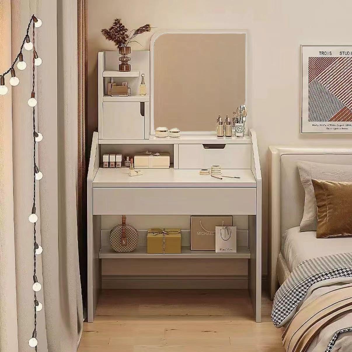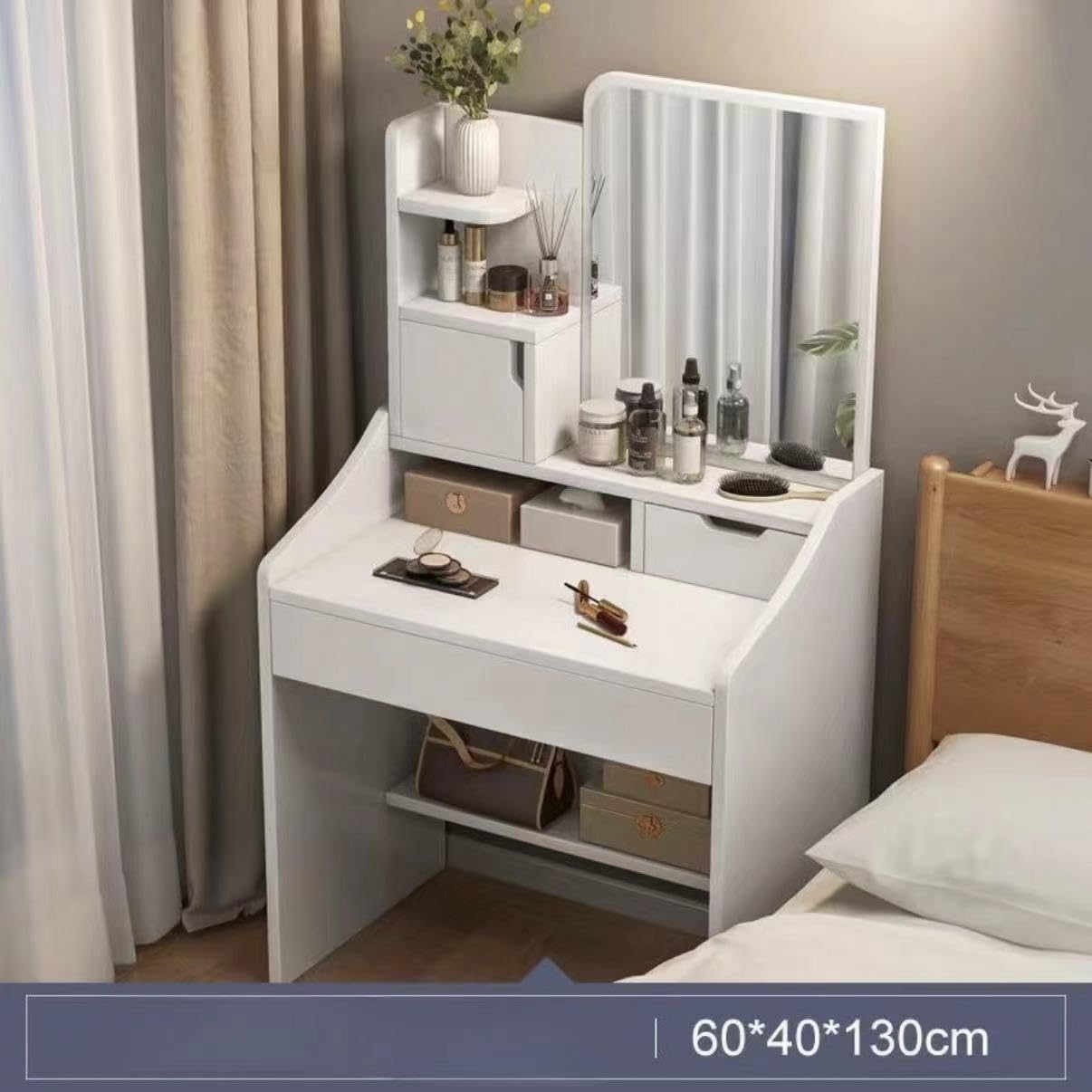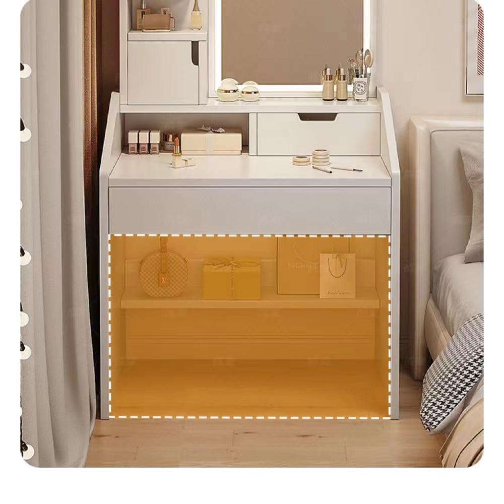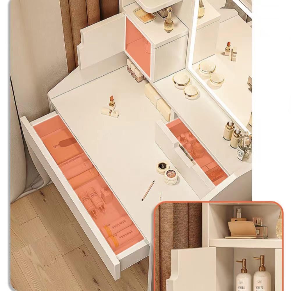 【コンパクトデザイン】ワンルームにも置けるシンプルでコンパクトなサイズなのに鏡面仕上げが高級感をプラスし、余裕のあるメイクスペースを確保し、煩雑小物も収納するから便利です。