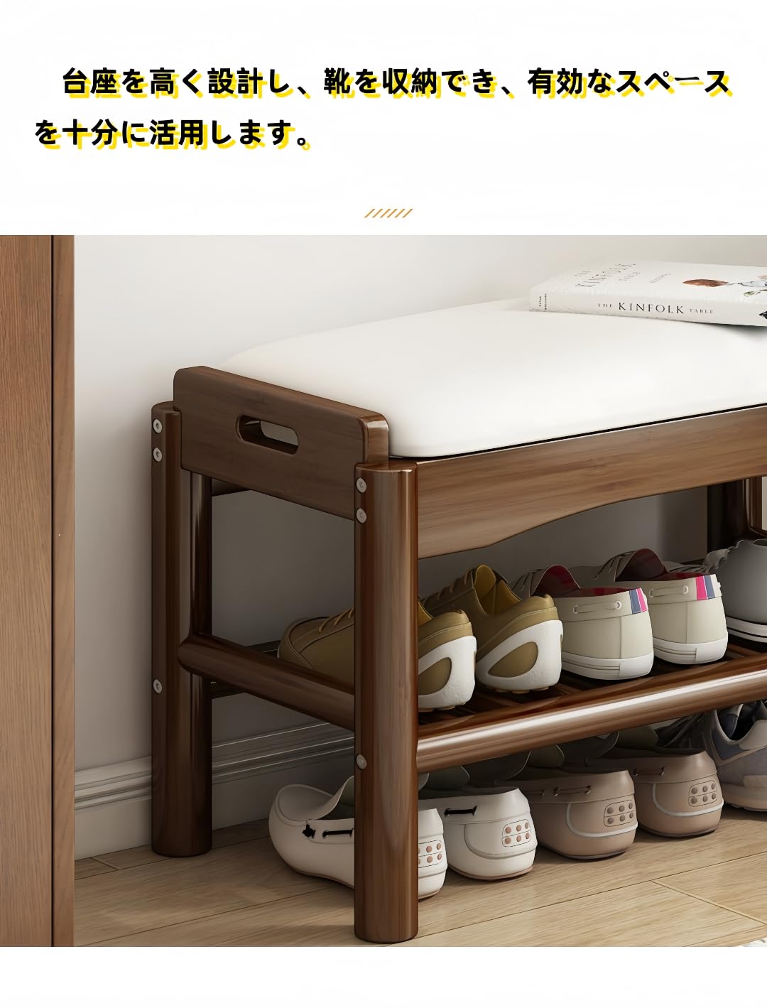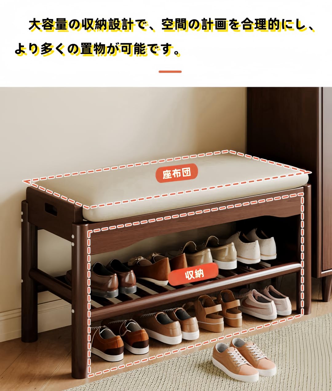 【多機能で、靴の履き替えと収納機能が一体化】シューズベンチは、靴の履き替え機能だけでなく、巧妙に設計された収納機能も兼ね備えています。大サイズの靴などをきちんと整理し、靴の履き替えプロセスをより便利にし、同時にリビングスペースを整頓した状態に保つことができます。