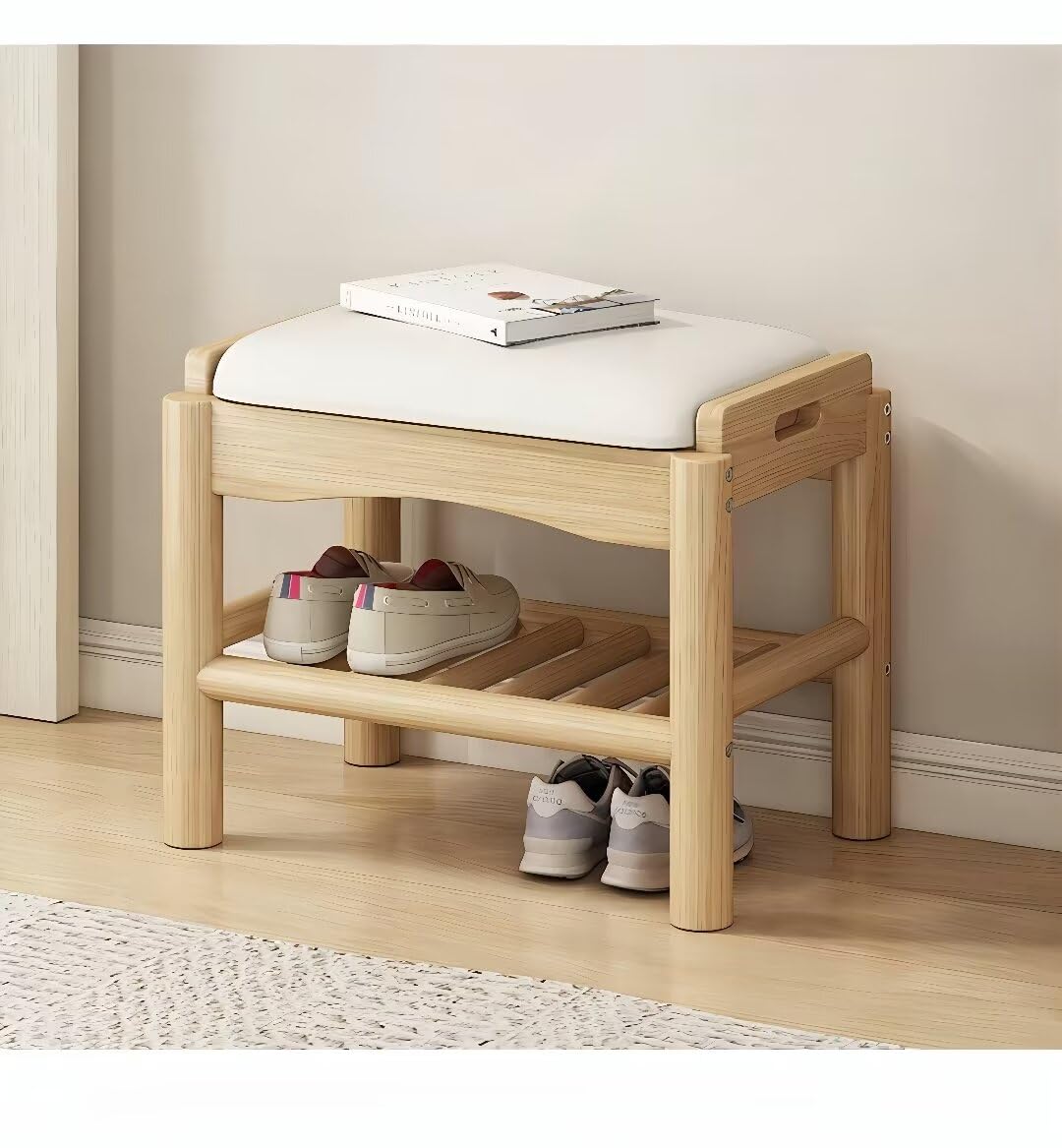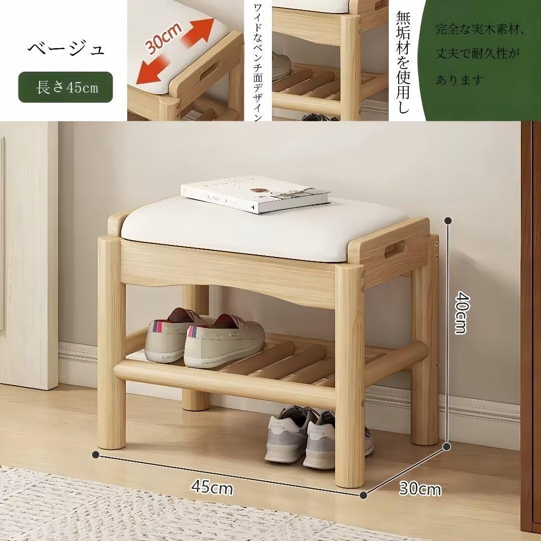 PANCY 玄関ベンチ 木製 無垢材 北欧 幅45cm 天然木 シューズラック 収納ベンチ 玄関椅子 玄関スツール シューズボックス 靴収納 雑貨 家具 (ウッドカラー、45x30x40cm)