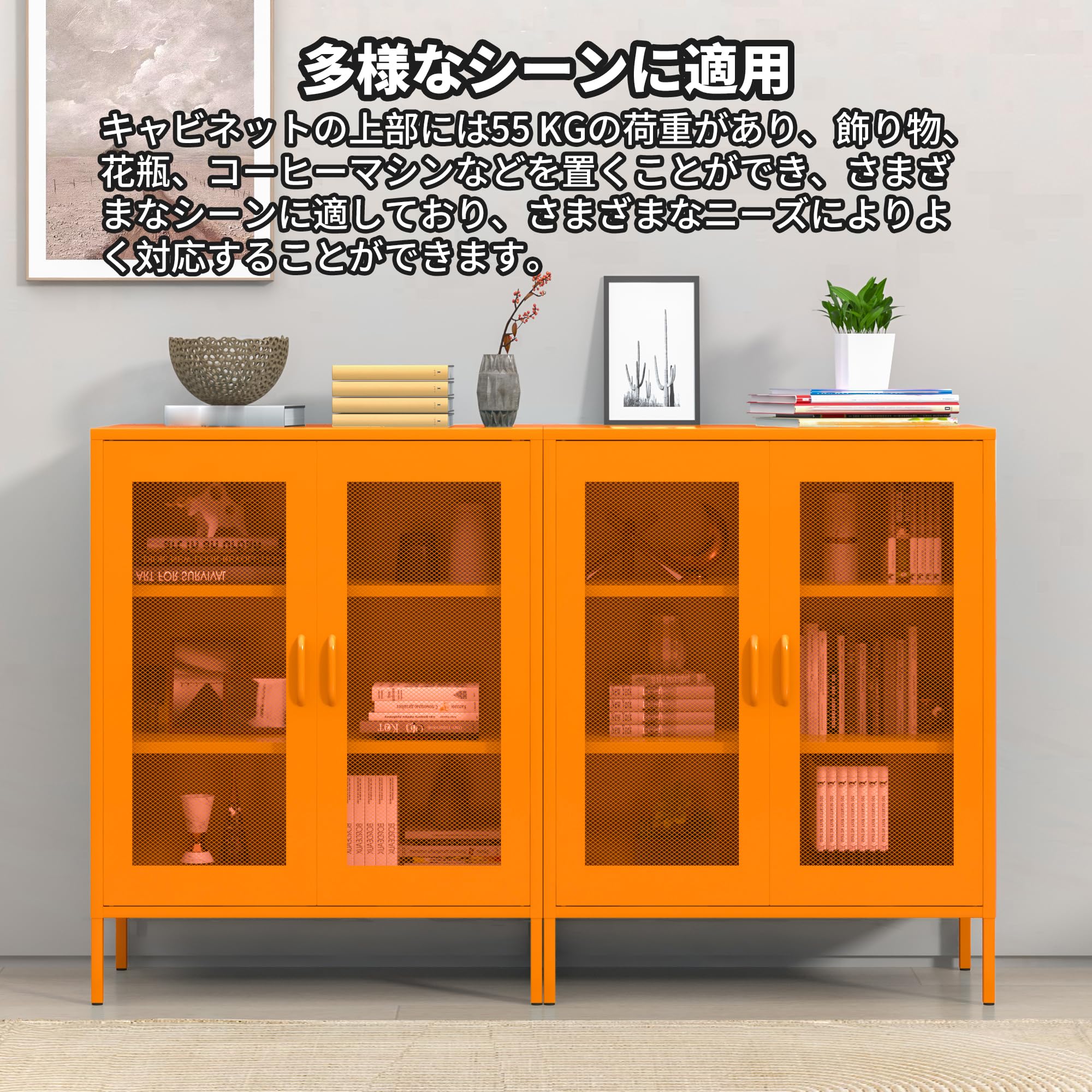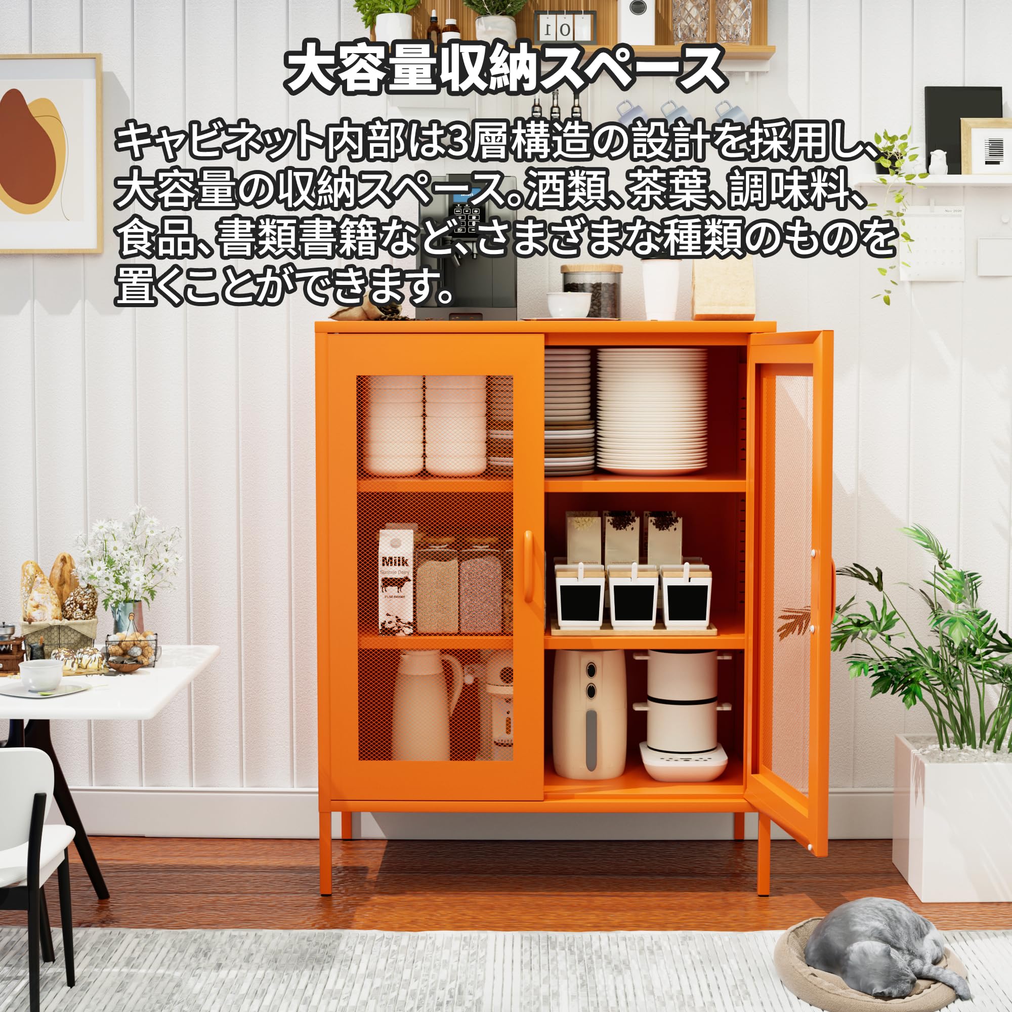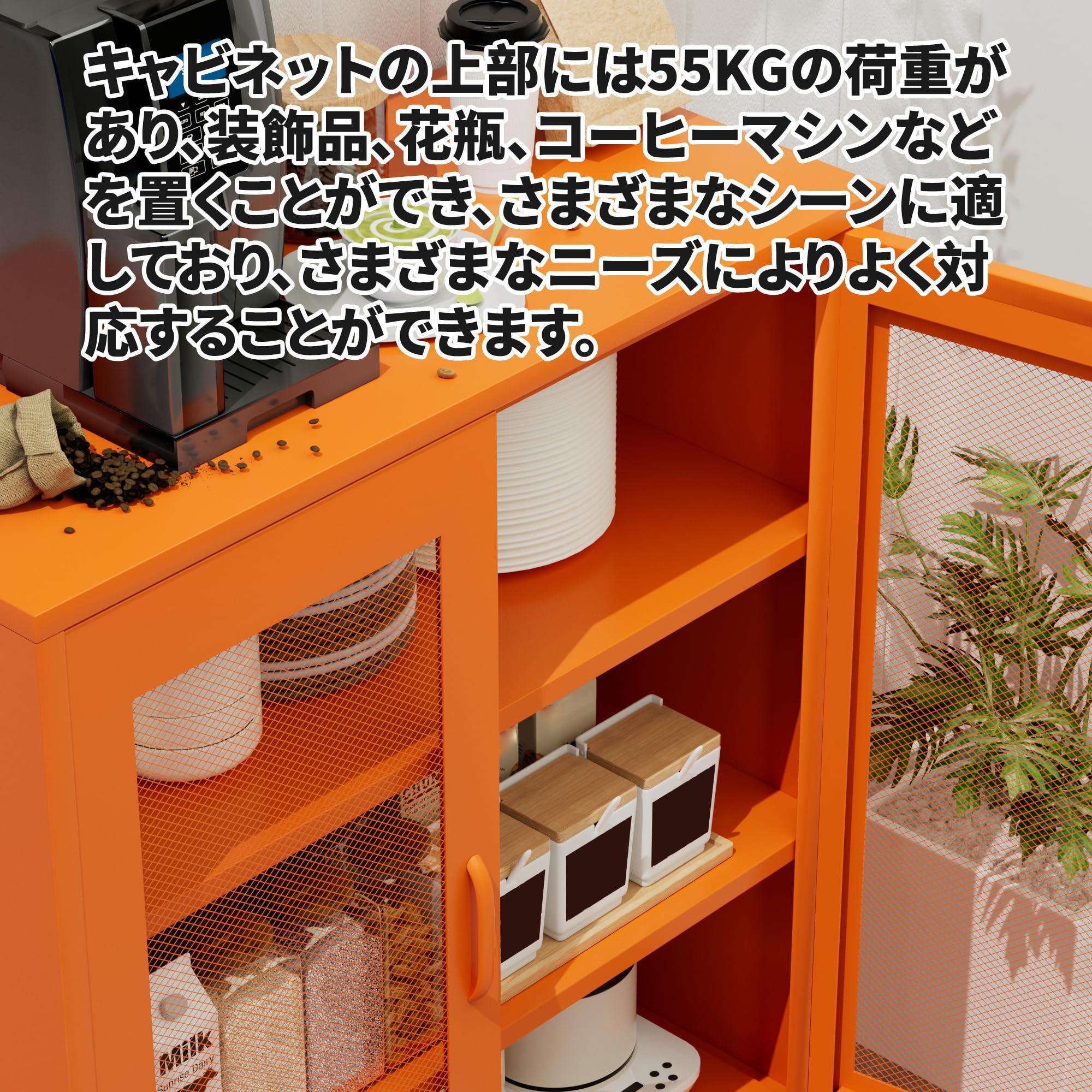 【セール】キャビネット スチール サイドボード 収納棚 扉付き 可動棚 大容量 リビング キチン ダイニングルーム 寝室用 幅80CM 組立品 (網面 オレンジ色)