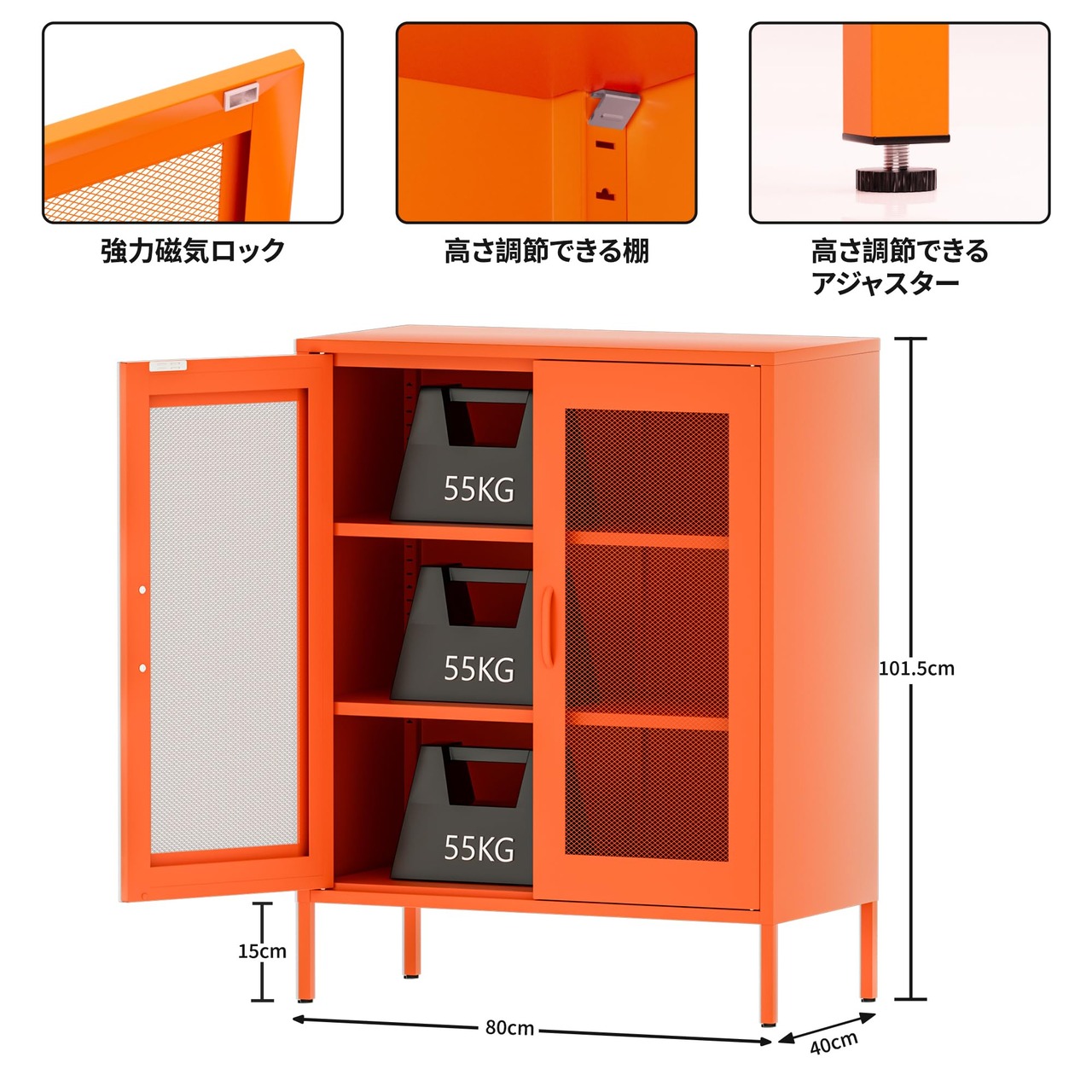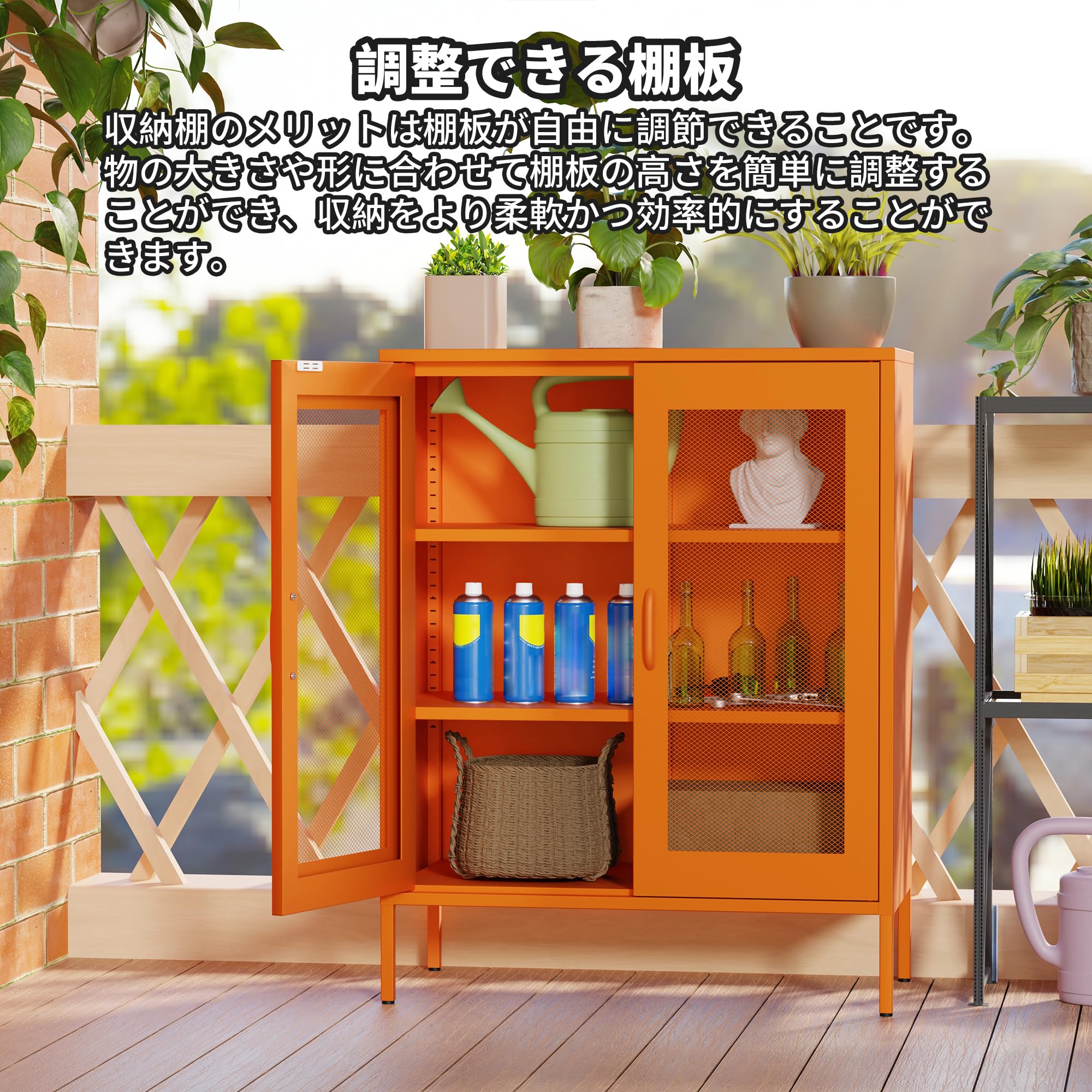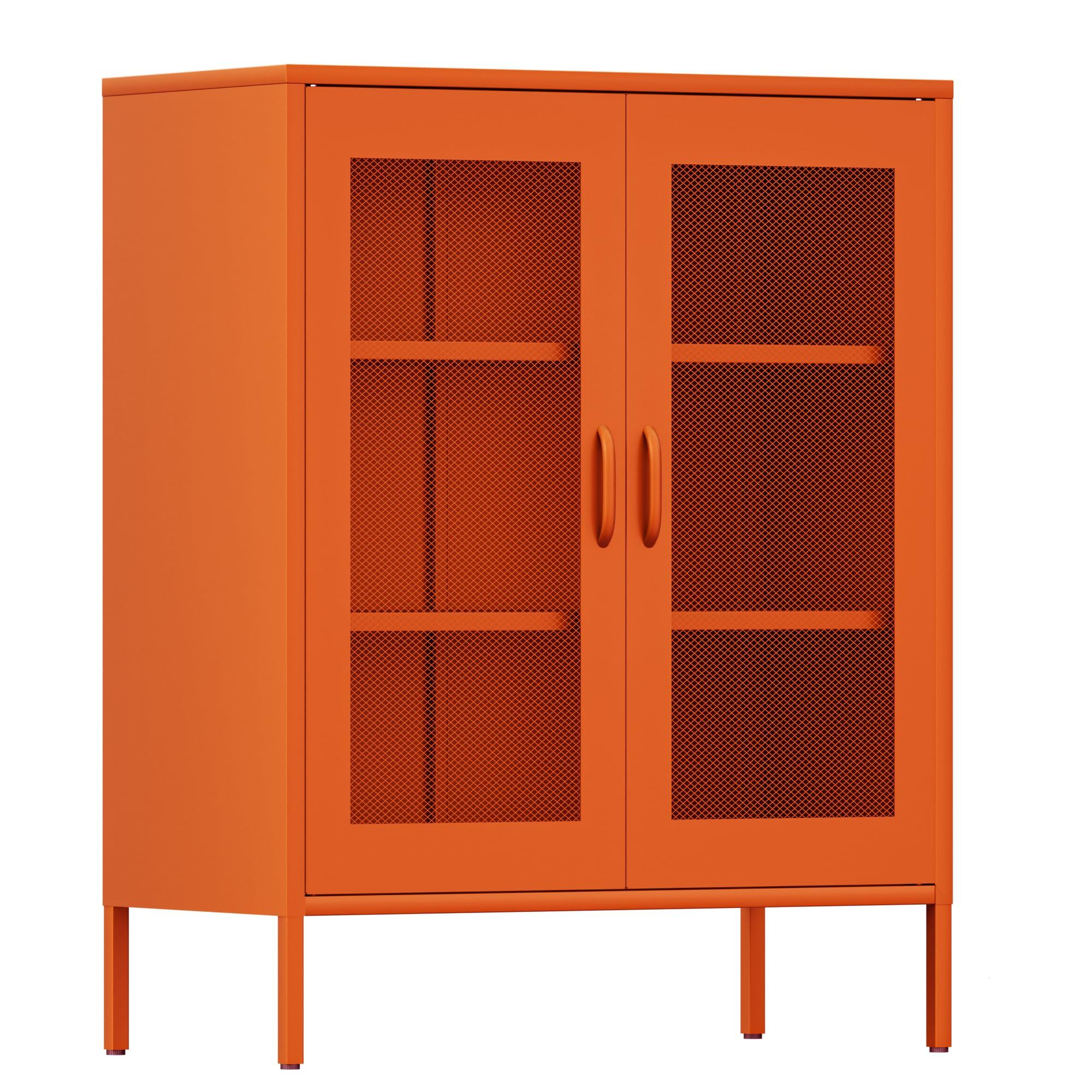 キャビネット スチール サイドボード 収納棚 扉付き 可動棚 大容量 リビング キチン ダイニングルーム 寝室用 幅80CM 組立品 (網面, オレンジ色)
