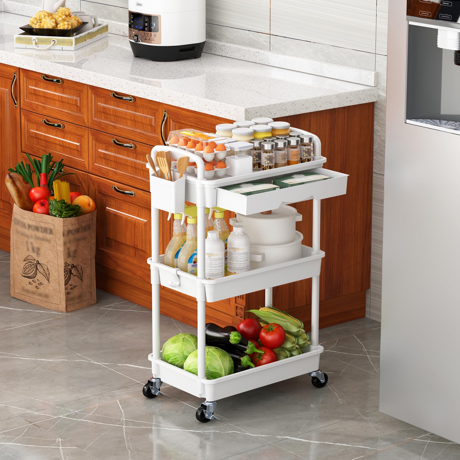Goovilla キッチンワゴン ローリング 3段 引き出し付き ハンドル付き 収納カップ 仕切板付き 多機能 小物 隙間収納 バスケットラック バスルーム オフィス キッチン用 収納ワゴン 幅37.8×奥行26.9×高さ75.9cm ホワイト