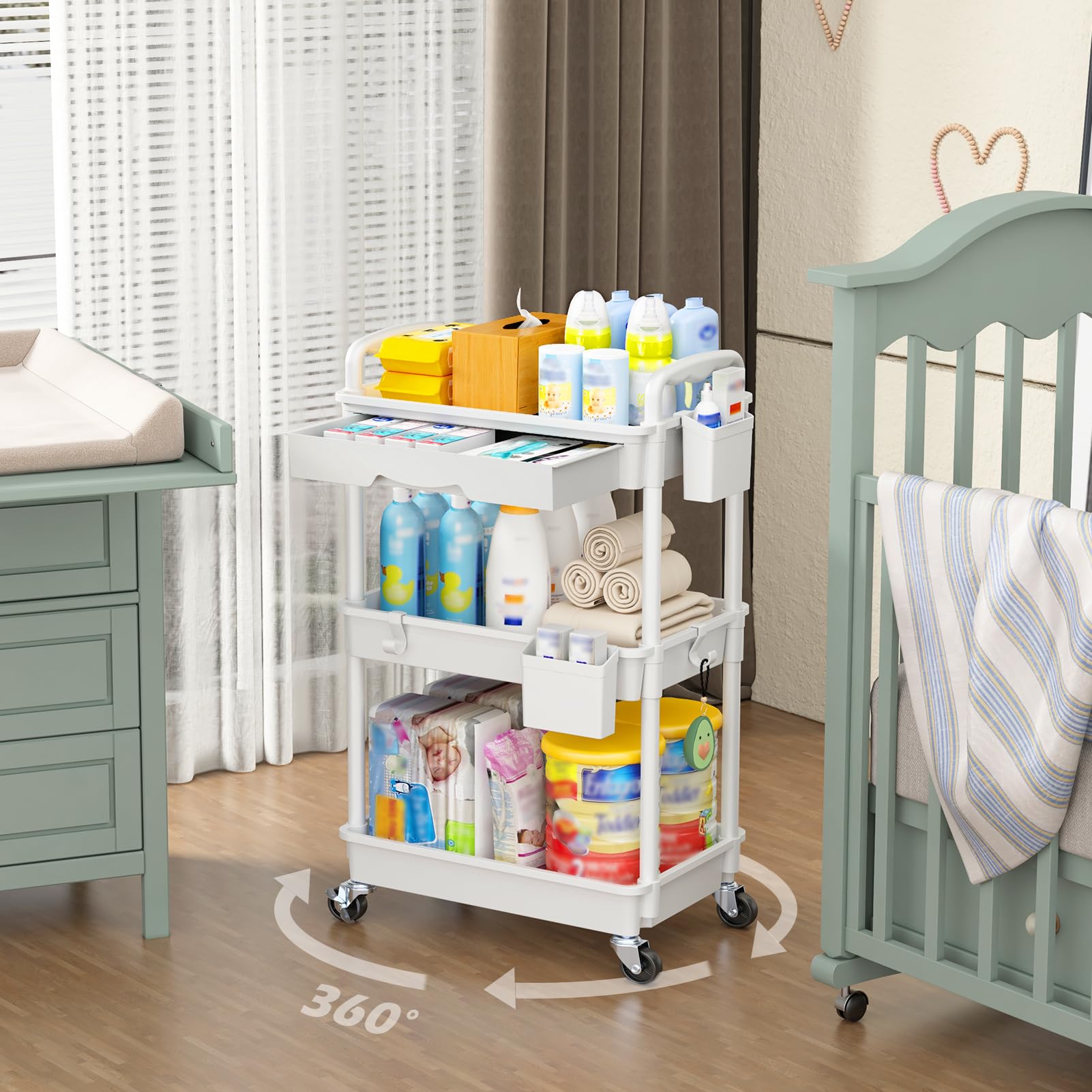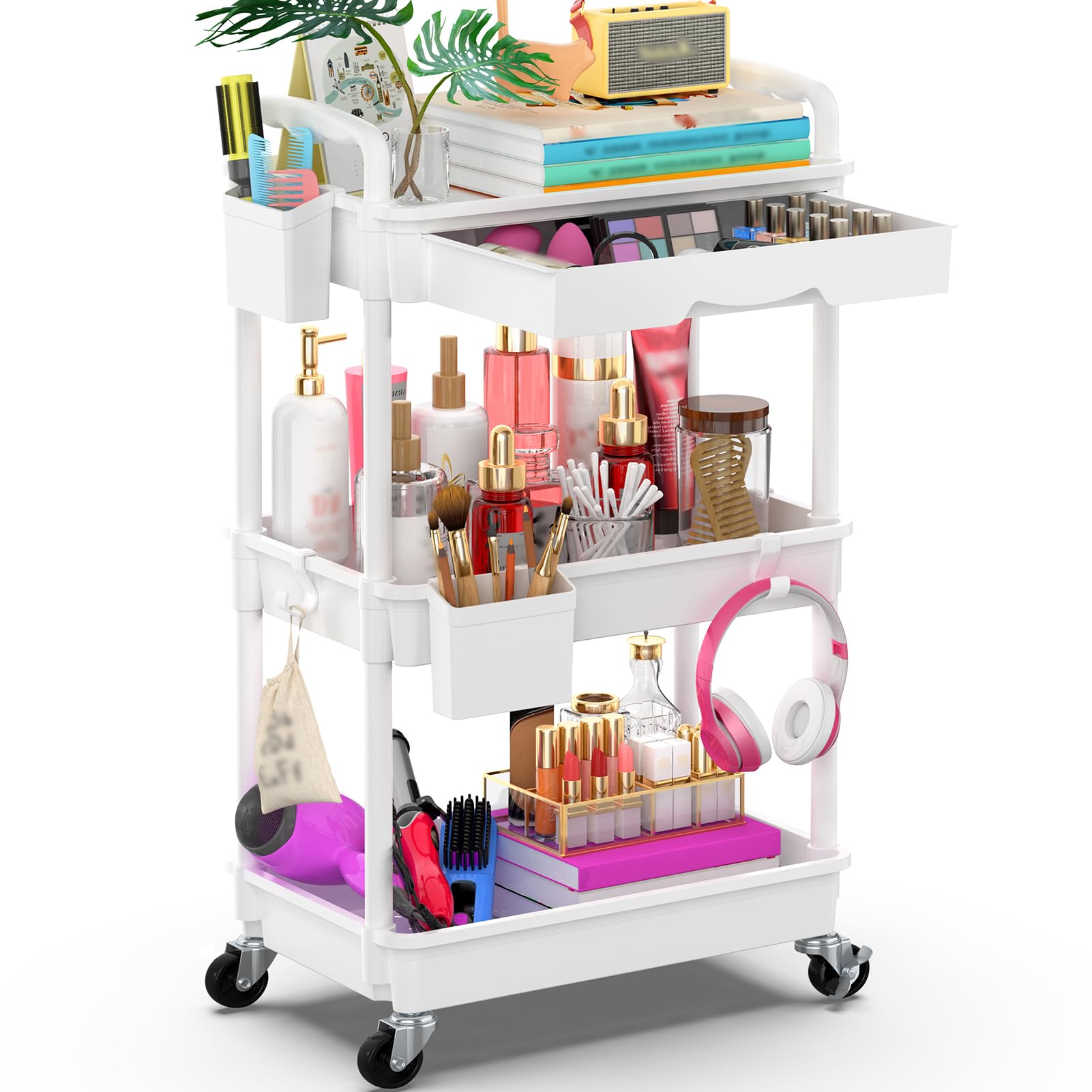 【セール】Goovilla キッチンワゴン ローリング 3段 引き出し付き ハンドル付き 収納カップ 仕切板付き 多機能 小物 隙間収納 バスケットラック バスルーム オフィス キッチン用 収納ワゴン 幅37.8×奥行26.9×高さ75.9cm ホワイト