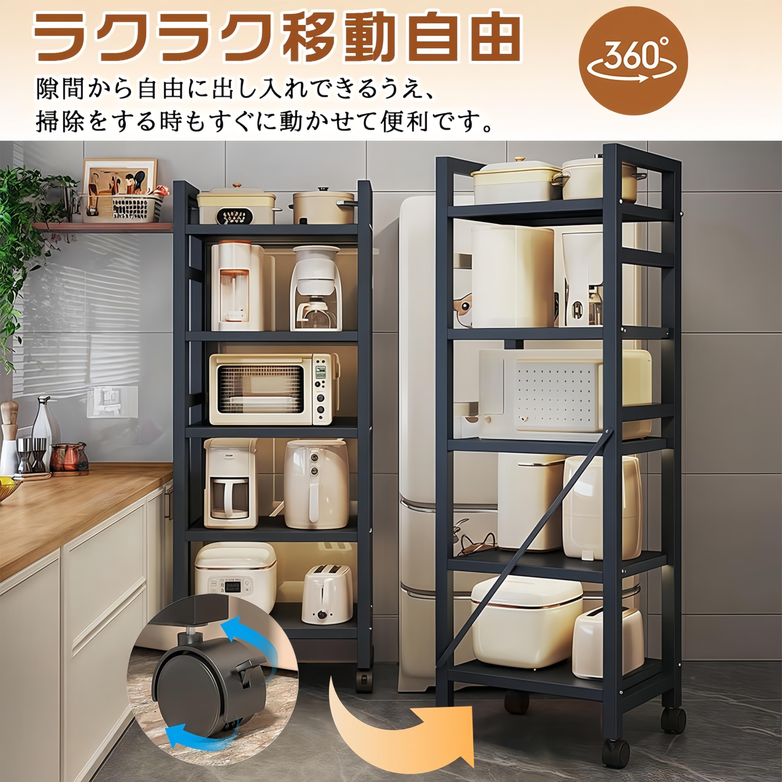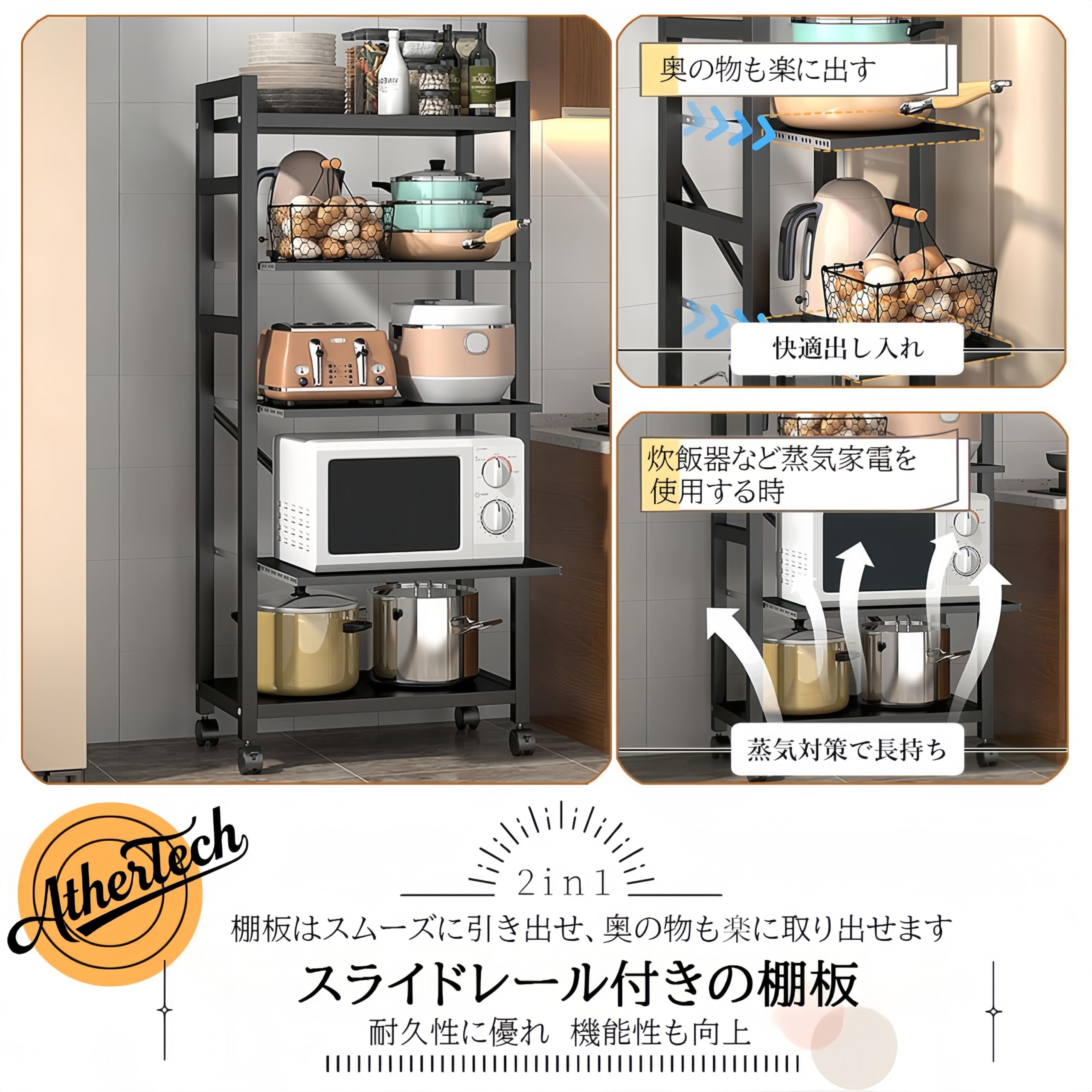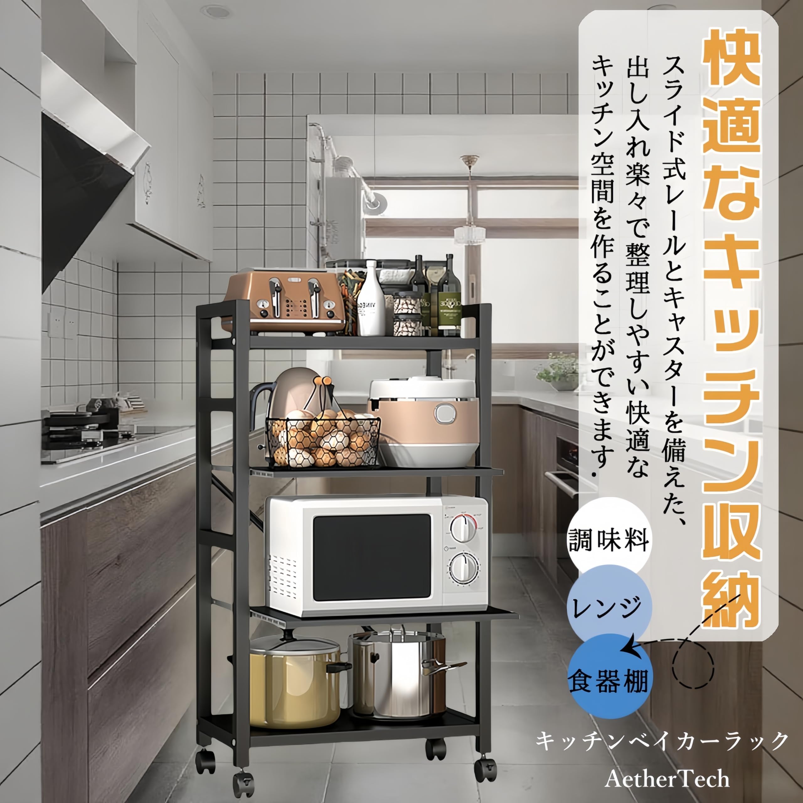 レンジラック レンジ台 大型レンジ対応 スライド棚 高さ130cm 幅55cm キッチンラック キャスター付き オープンラック スリム おしゃれ 落下防止 省スペース 頑丈 耐摩耗性 防水性