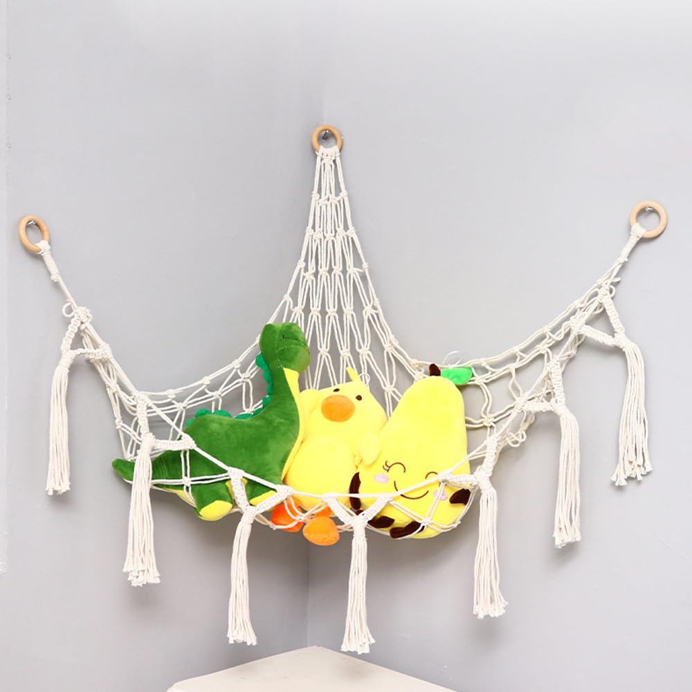 デザイン:三角形は良好な安定性を持ち、高柔軟性の綿糸を用いて簡潔で おしゃれな高実用性ハンモック型収納ネットを編み出し、数個のぬいぐるみの重量を積載することができます。