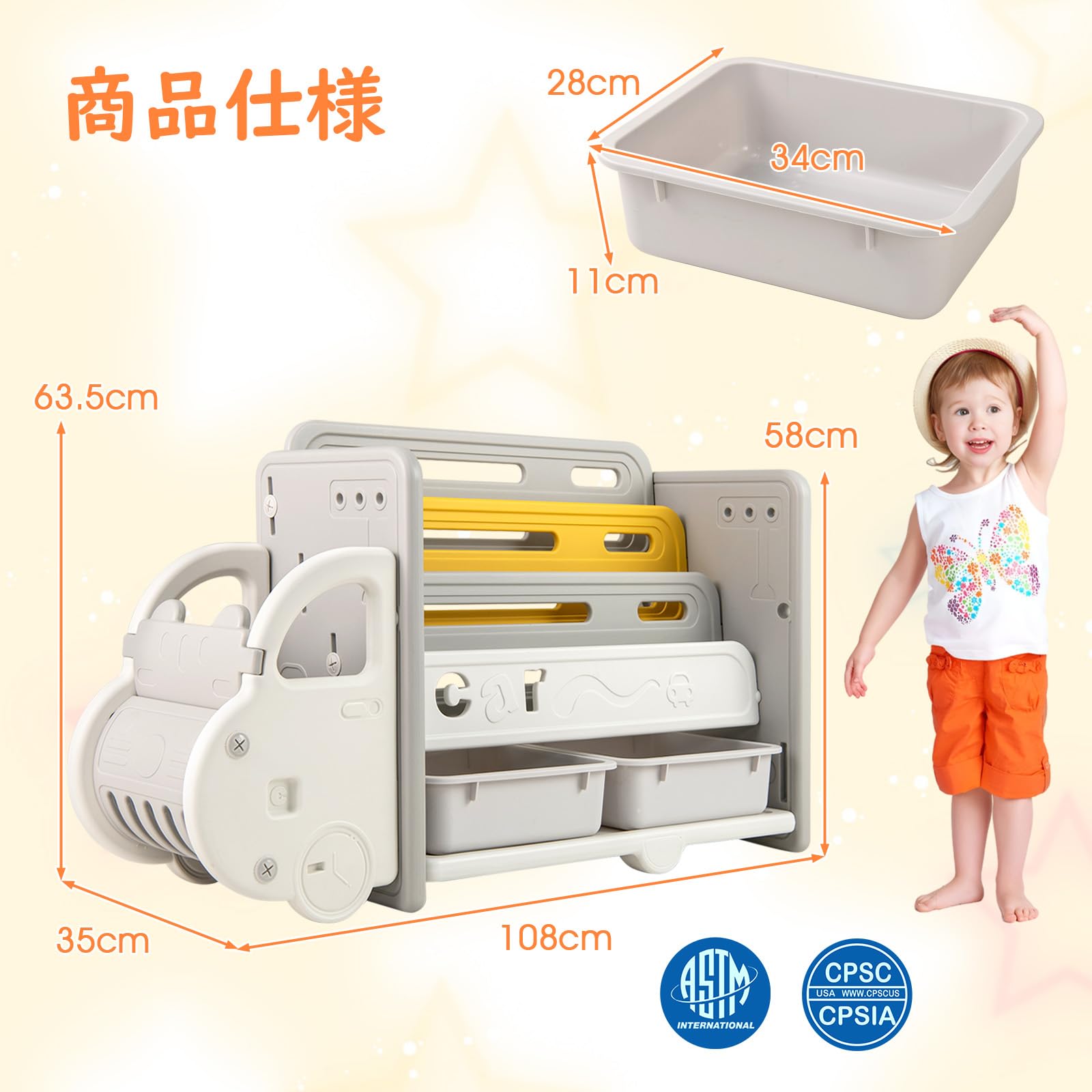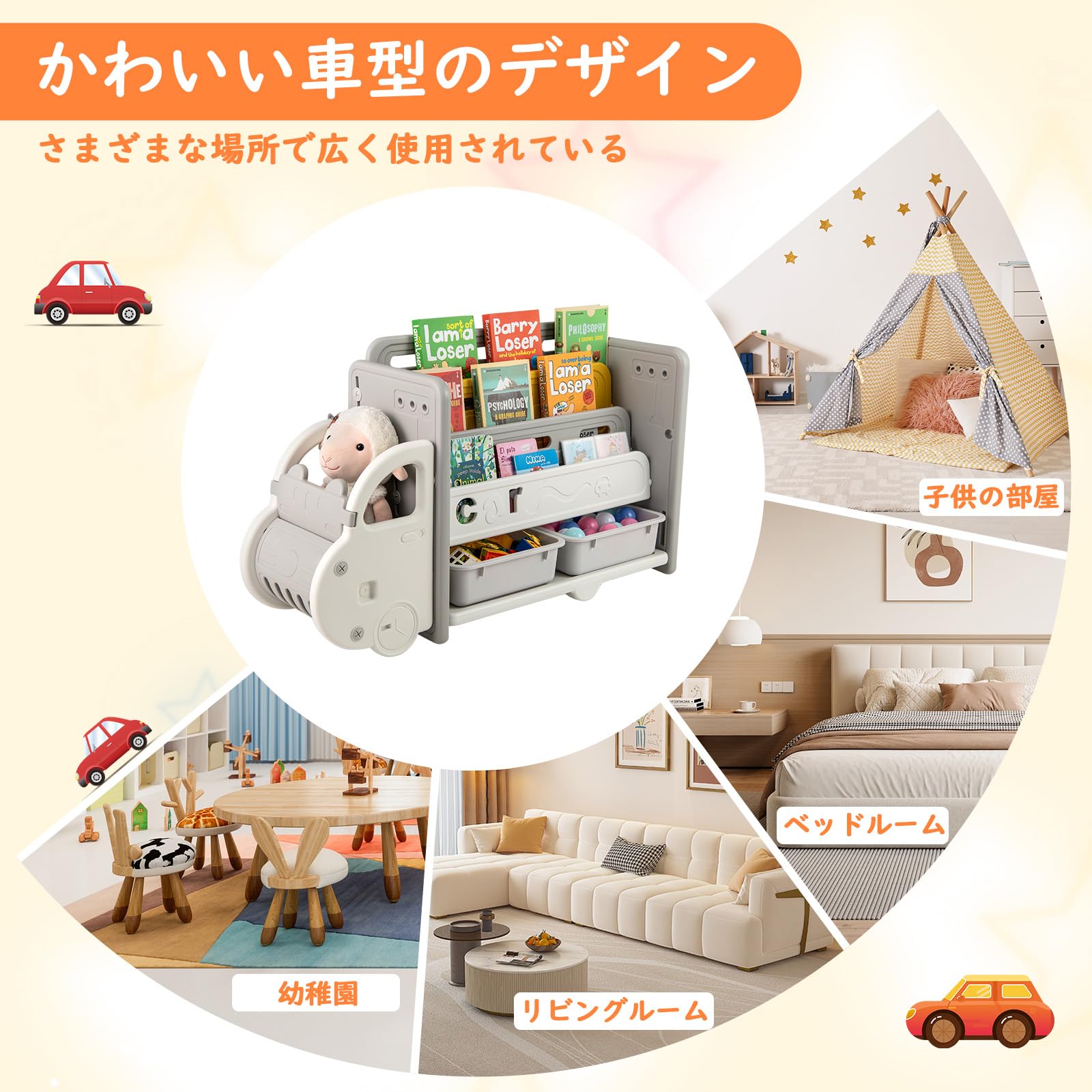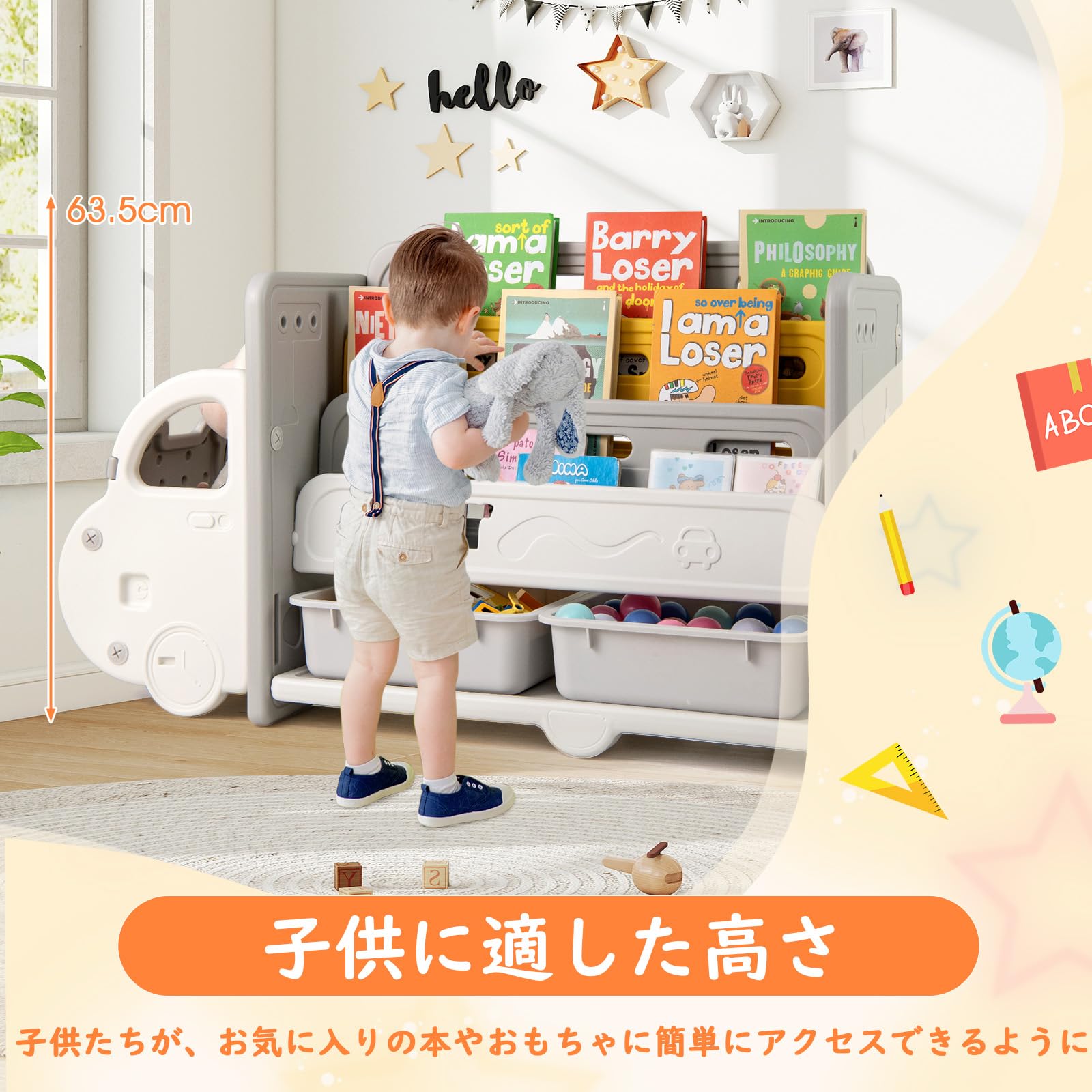 【分類収納】収納整理棚には、車頭収納スペース、3段の本棚、および2つの玩具収納ボックスが備わっています。十分な収納スペースにより、子どもの本、おもちゃなどを収納可能です。
