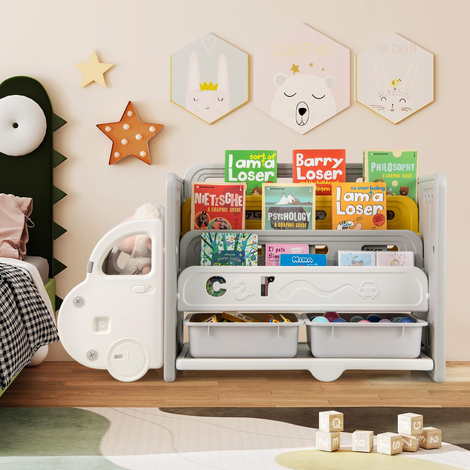 【特価在庫】COSTWAY おもちゃ収納ラック 車造型 おもちゃラック 絵本ラック おもちゃ箱 おもちゃ収納棚 幅108cm 大容量 分類収納 おもちゃ収納 絵本収納 子供用シェルフ 収納ラック 収納棚 収納ボックス 収納箱 グレー | GIGATERA