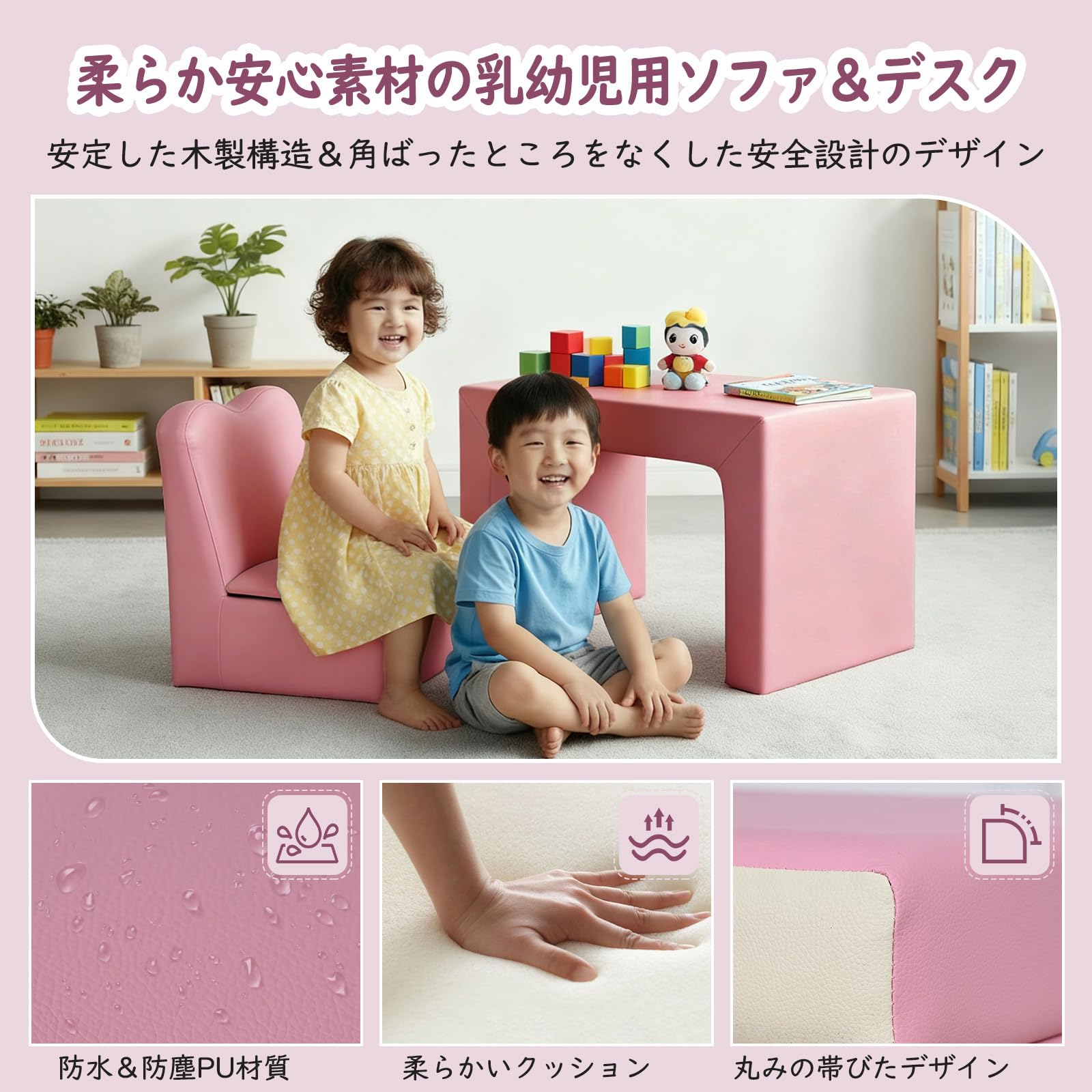【柔らか安心素材の子供用ソファ&デスク】本製品はお子様の使用に最適な安全安心な素材を厳選しています。主要部材には木材、高密度スポンジ、そして高級PUレザーを採用。これらの素材はすべてお子様や周囲の環境に無害なものを使用しており、安全性に配慮しています。特に高級PUレザーは肌触りが滑らかで、優れた耐久性と通気性を備えています。生活防水加工も施されているため、飲み物をこぼしてしまっても簡単にお手入れできるのが魅力です。座面には高反発スポンジを厚く充填。長時間座っても変形しにくく、立ち上がるとすぐに元の形状に戻る特性を持っています。これにより、お子様にいつでも快適な座り心地を提供します。