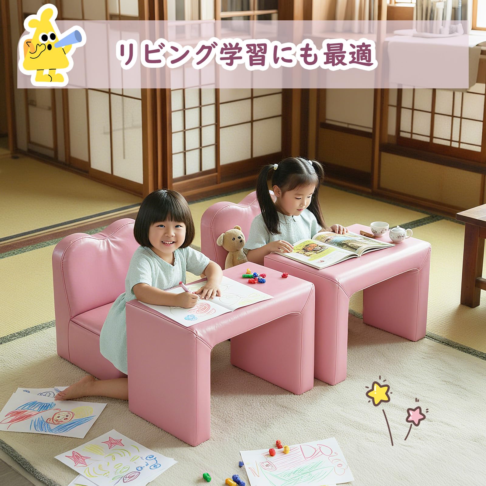 【2点セット&2way仕様】デスクとチェアの便利な2点セットです。お子様の想像力を育てるをコンセプトに設計した幼児用ソフア & デスク。組み合わせればお子様用のソフアに、2 つに分ければ机と椅子になる 2 通りの使い方ができます。ソファとして使うのはもちろん、リビング学習にも最適です。椅子は広くゆとりのある設計になっているので、乳児期から幼児期までながくお使いいただけます。
