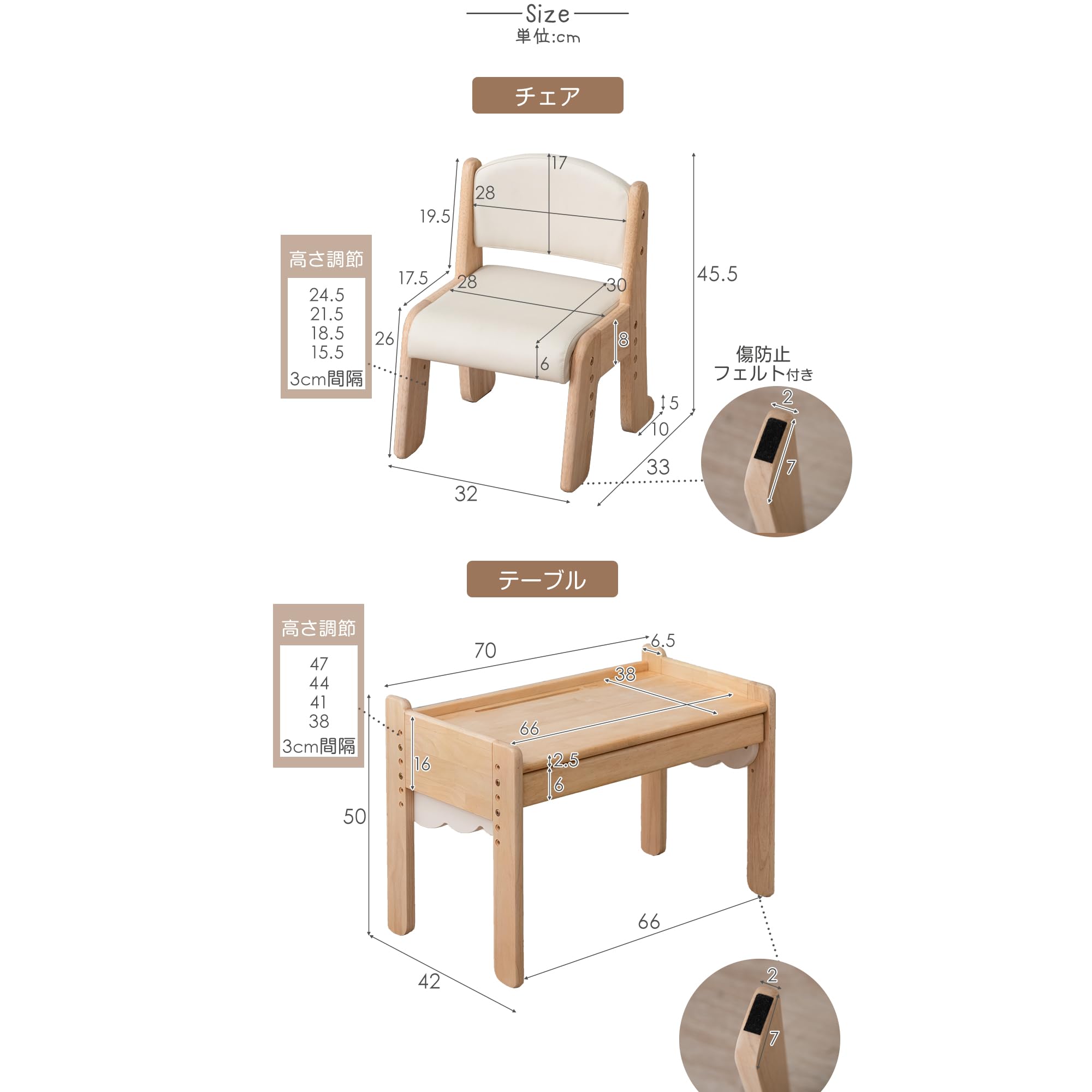 【サイズ】テーブル:幅70×奥行42×50cm 天板高さ:47/44/41/38cm チェア:幅32×奥行33×高さ45.5cm 座面高さ 4段階調節:24.5/21.5/18.5/15.5cm 【重量】テーブル:12kg チェア:4kg