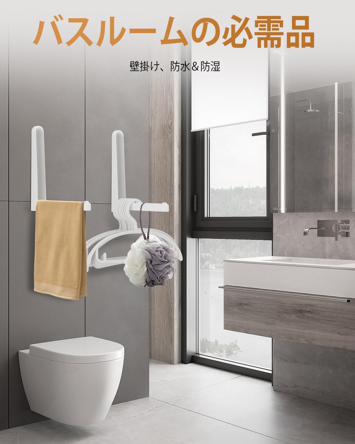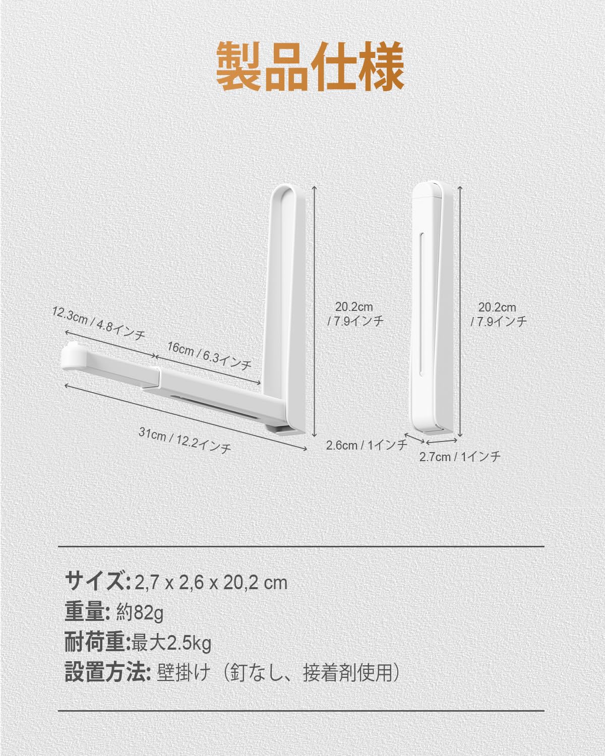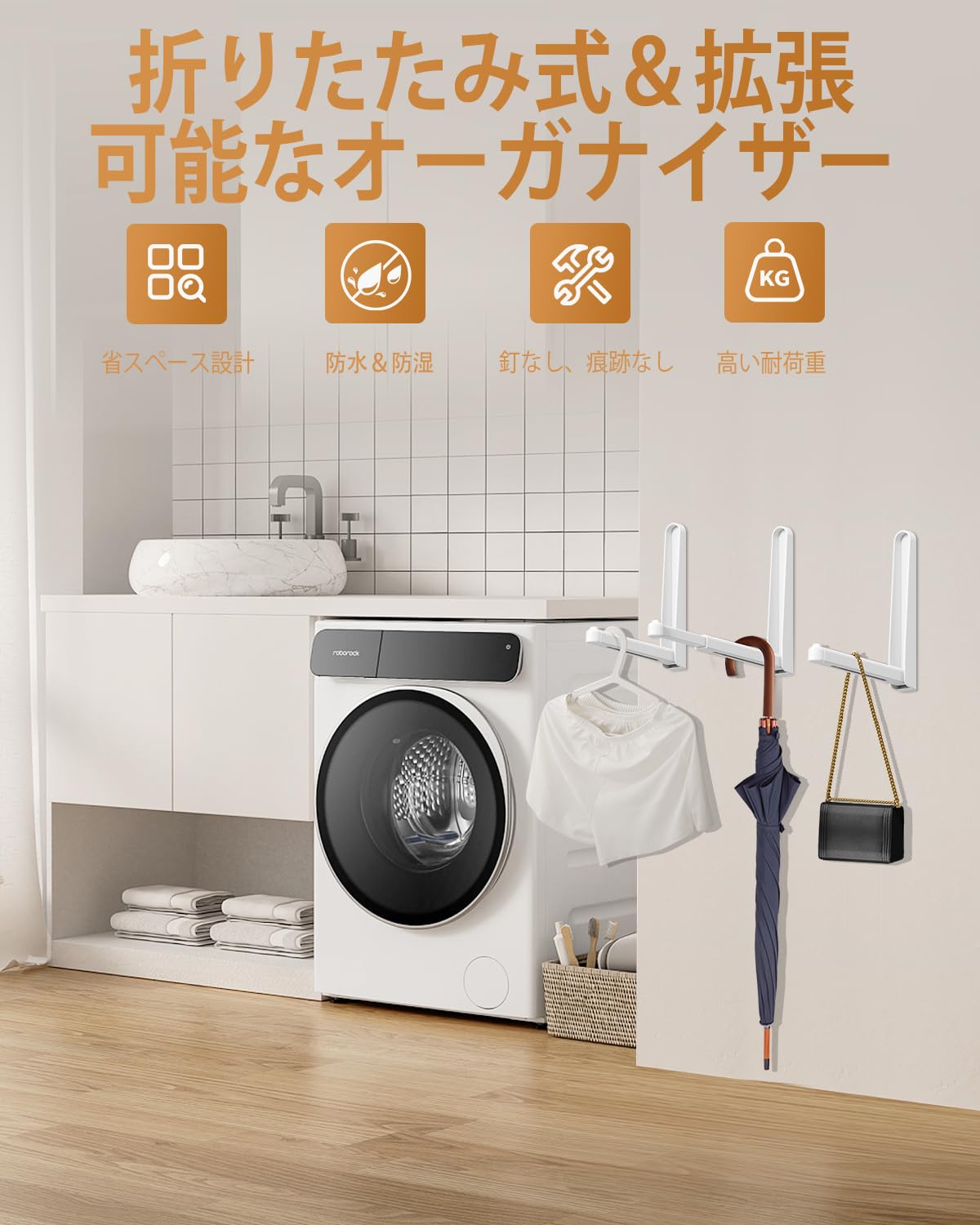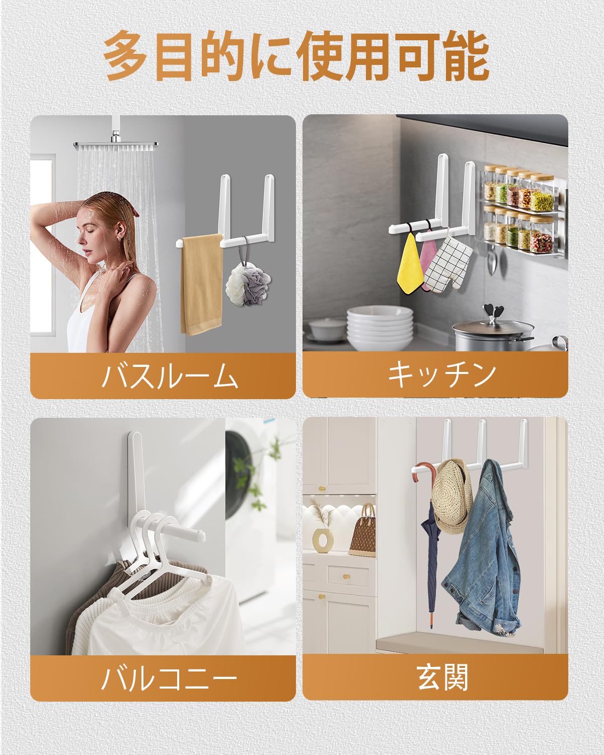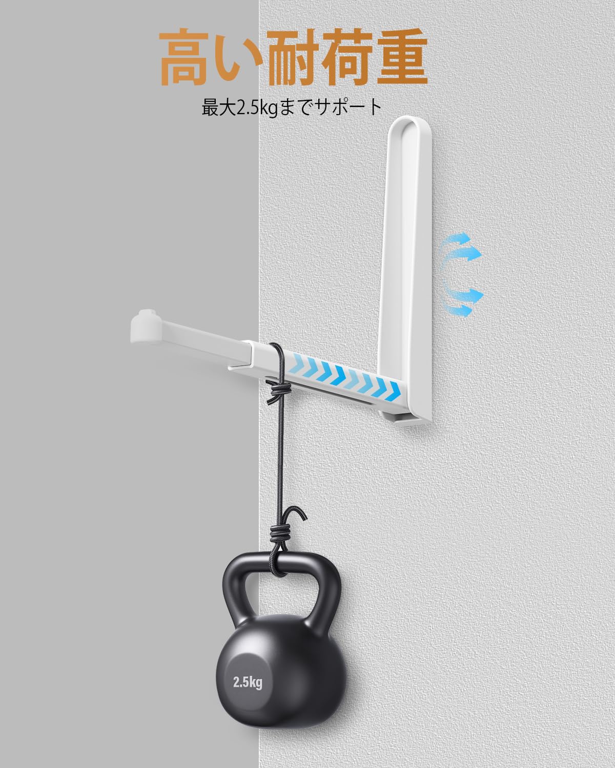 【耐荷重2.5kg|毎日使える頑丈な構造】耐久性に優れたABS素材を採用し、最大2.5kgまでしっかり支えます。タオル、洗濯物、帽子、バッグ、小物など、日常使いに十分な強度です。