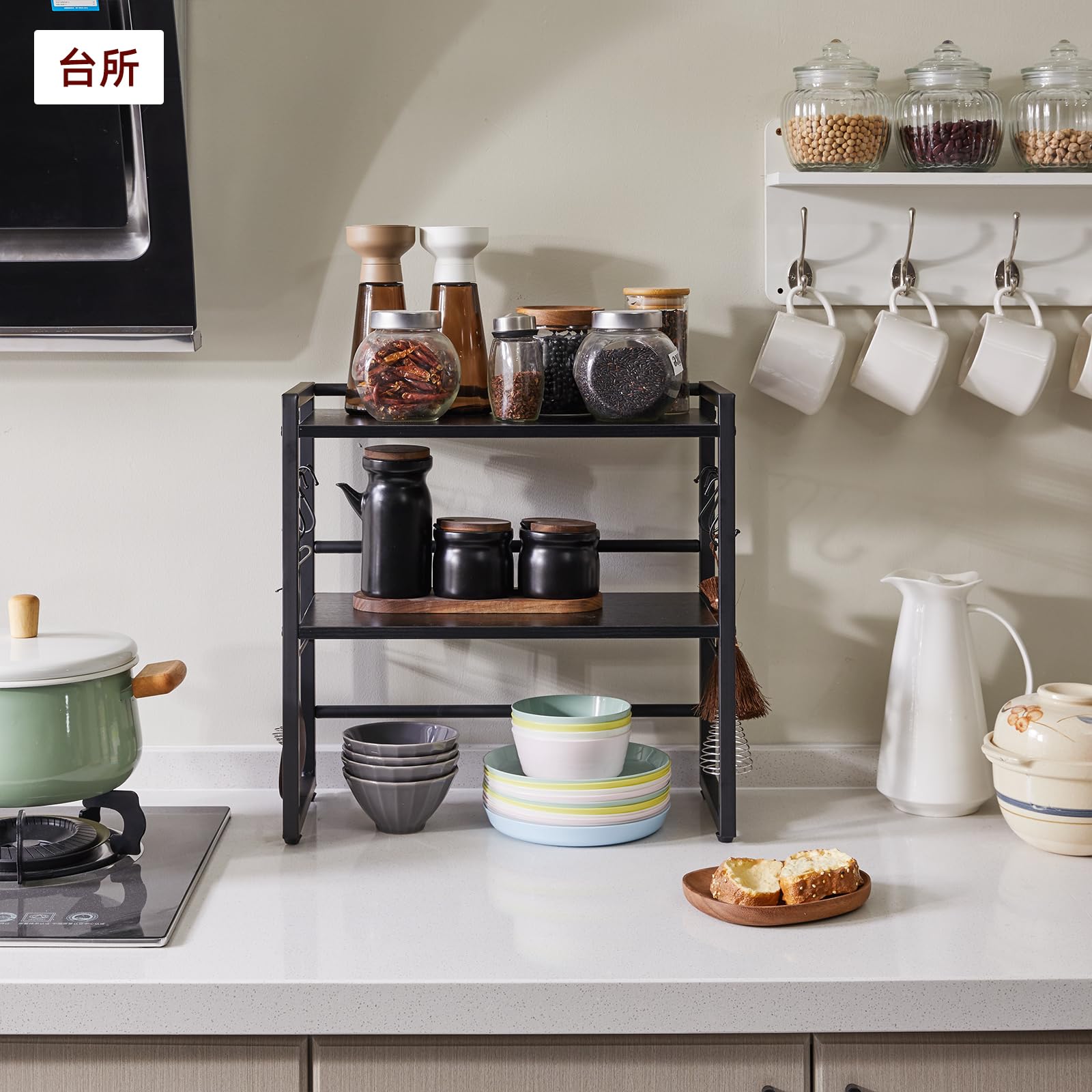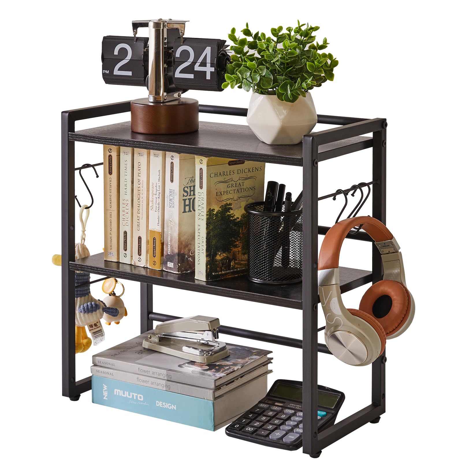 【在庫処分】デスクシェルフ 本立て 卓上 ラック 2段 幅43×奥行20×高さ43cm 小物収納棚 キッチン収納 フックが6つ 机上ラック 台 棚板高さ調節可 黒 YD-DSR001B | GIGATERA